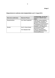 5 Anlage 3 Beigeordnete der Landkreise nebst Aufgabenfeldern zum 31. August 2013: Aufgabenfelder, die die Per- Name des Landkreises: Name der Person: son zum 31.08.2013 wahr- nahm: Burgenlandkreis Herr Dieter Engelhardt Veterinär-/Lebensmittelüber- wachungsamt, Sozialamt, Ju- gendamt, Gesundheitsamt, Bauordnung, Immissionsschutz und Abfallwirtschaft, Amt für Gewässer- und Naturschutz Stendal Herr Dr. Denis Gruber Schulverwaltung, Kultur, Bauordnung, Umwelt Herr Sebastian Stoll Ordnung, Straßenverkehr, Soziales/Jugend/Gesundheit Wirtschaftsförderung