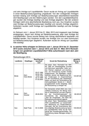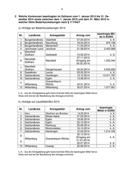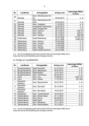 3 beantragte Mittel Nr. Landkreis Antragsteller Antrag vom in Euro Gem. Altmärkische Hö- 30 Stendal he 20.02.2013 k. A. Gem. Altmärkische Wi- 31 Stendal sche 20.02.2013 k. A. 32 Stendal Gem. Goldbeck 11.03.2013 k. A. 33 Stendal Hansestadt Seehausen 20.02.2013 k. A. 34 Stendal Stadt Tangerhütte 30.07.2013 k. A. 35 Stendal Gem. Kamern 20.12.2013 232.191 36 Stendal Gem. Klietz 20.12.2013 242.011 37 Stendal Gem. Sandau 20.12.2013 209.235 38 05.02.2008 10.792.316 Wittenberg Stadt Wittenberg 39 20.01.2009 8.865.225 40 Wittenberg Gem. Gohrau 30.06.2009 k. A. 41 Wittenberg Gem. Griesen 13.08.2009 k. A. 42 Wittenberg Gem. Kakau 13.08.2009 k. A. 43 Wittenberg Gem. Riesigk 14.07.2009 k. A. 44 Wittenberg Stadt Gräfenhainichen 22.04.2008 k. A. k. A. - Aus der Antragstellung geht keine konkrete Höhe der beantragten Mittel hervor. Diese wird erst bei der Bearbeitung des Antrages errechnet. b.) Anträge auf Liquiditätshilfen: beantragte Mittel Nr. Landkreis Antragsteller Antrag vom in Euro 1 Burgenlandkreis Stadt Osterfeld 01.07.2013 k. A. 2 Burgenlandkreis Gem. Mertendorf 09.04.2013 k. A. 3 Burgenlandkreis Stadt Stößen 10.07.2013 k. A. 4 Burgenlandkreis Gem. Schönburg 09.04.2013 k. A. 5 Harz Gem. Huy 10.08.2013 1.230.772 6 Harz Gem. Rieder 11.07.2013 551.000 Mansfeld- 7 Gem. Blankenheim 23.07.2012 k. A. Südharz Mansfeld- 8 Gem. Benndorf 30.10.2012 k. A. Südharz Mansfeld- 9 Gem. Bornstedt 18.03.2013 k. A. Südharz 10 Saalekreis Gem. Teutschenthal 16.04.2013 k. A. 11 Salzlandkreis Gem. Börde-Hakel 21.11.2012 k. A. 12 Salzlandkreis Gem. Borne 28.05.2013 k. A. 13 Salzlandkreis Stadt Egeln 19.07.2013 k. A. 14 Salzlandkreis Gem. Bördeaue 18.11.2013 k. A. 15 Salzlandkreis Gem. Wolmirsleben 10.12.2013 k. A. k. A. - Aus der Antragstellung geht keine konkrete Höhe der beantragten Mittel hervor. Diese wird erst bei der Bearbeitung des Antrages errechnet.