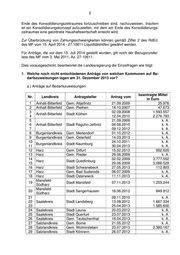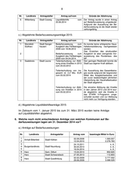 9 Nr. Landkreis Antragsteller Antrag vom beantragte Mittel in Euro 10 Harz Gem. Bad Suderode 06.07.2009 k. A. 11 Jerichower Land Stadt Jerichow 21.08.2014 2.453.968 12 18.06.2012 849.912 Mansfeld-Südharz Stadt Sangerhausen 13 04.04.2014 k. A. 14 Mansfeld-Südharz Stadt Mansfeld 07.11.2013 1.255.244 15 Mansfeld-Südharz Stadt Gerbstedt 10.02.2014 k. A. 16 20.03.2012 k. A. Saalekreis Stadt Leuna 17 05.02.2014 k. A. 18 Saalekreis Stadt Querfurt 23.07.2013 k. A. 19 09.11.2010 k. A. 20 Saalekreis Stadt Landsberg 13.08.2012 1.667.334 21 25.04.2013 1.585.600 22 Salzlandkreis Stadt Könnern 26.07.2012 k. A. 23 Salzlandkreis Stadt Hecklingen 13.10.2014 13.471.796 24 Salzlandkreis Gem. Wolmirsleben 23.07.2013 2.380.167 25 Stendal Gem. Altmärkische Höhe 20.02.2013 k. A. Gem. Altmärkische Wi- 26 Stendal 20.02.2013 k. A. sche 27 Stendal Hansestadt Seehausen 20.02.2013 k. A. 28 Stendal Gem. Goldbeck 11.03.2013 k. A. 29 Stendal Stadt Tangerhütte 30.07.2013 k. A. 30 Stendal Gem. Kamern 20.12.2013 232.191 31 Stendal Gem. Klietz 20.12.2013 242.011 32 Stendal Gem. Sandau 20.12.2013 209.235 k. A. - Aus der Antragstellung geht keine konkrete Höhe der beantragten Mittel hervor. Diese wird erst bei der Bearbeitung des Antrages errechnet. b.) Anträge auf Liquiditätshilfen Nr. Landkreis Antragsteller Antrag vom beantragte Mittel in Euro 1 Mansfeld-Südharz Gem. Benndorf 30.10.2012 k. A. 2 Mansfeld-Südharz Gem. Blankenheim 23.07.2012 k. A. 3 Mansfeld-Südharz Gem. Bornstedt 18.03.2013 k. A. 4 Salzlandkreis Gem. Wolmirsleben 16.10.2014 k. A. 5 Salzlandkreis Stadt Egeln 30.10.2014 k. A. 6 Salzlandkreis Gem. Bördeaue 18.11.2013 k. A. 7 Salzlandkreis Stadt Nienburg 23.09.2014 k. A. Stadt Oranienbaum- 8 Wittenberg 30.07.2014 k. A. Wörlitz k. A. - Aus der Antragstellung geht keine konkrete Höhe der beantragten Mittel hervor. Diese wird erst bei der Bearbeitung des Antrages errechnet. 7. Wie stellte sich das Verhältnis von Anträgen, Bewilligungen und Ablehnun- gen der Bedarfszuweisungen aus dem Ausgleichsstock im Zeitraum vom 1. Januar 2014 bis 31. Dezember 2014 sowie zwischen dem 1. Januar 2015 und dem 31. März 2015 dar? Im Zeitraum vom 1. Januar 2014 bis 31. Dezember 2014 sind insgesamt zwei- undzwanzig Anträge eingegangen, davon zwölf Anträge auf Bedarfszuweisungen