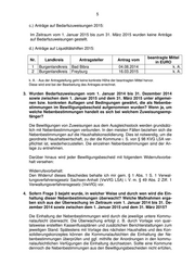 5 c.) Anträge auf Bedarfszuweisungen 2015: Im Zeitraum vom 1. Januar 2015 bis zum 31. März 2015 wurden keine Anträge auf Bedarfszuweisungen gestellt. d.) Anträge auf Liquiditätshilfen 2015: beantragte Mittel Nr. Landkreis Antragsteller Antrag vom in EURO 1 Burgenlandkreis Bad Bibra 04.08.2014 k. A. 2 Burgenlandkreis Freyburg 16.03.2015 k. A. k. A. - Aus der Antragstellung geht keine konkrete Höhe der beantragten Mittel hervor. Diese wird erst bei der Bearbeitung des Antrages errechnet. 3. Wurden Bedarfszuweisungen vom 1. Januar 2014 bis 31. Dezember 2014 sowie zwischen dem 1. Januar 2015 und dem 31. März 2015 unter allgemei- nen bzw. konkreten Auflagen und Bedingungen gewährt, die als Nebenbe- stimmungen im Bewilligungsbescheid aufgenommen wurden? Wenn ja, um welche Nebenbestimmungen handelt es sich bei welchem Zuweisungsemp- fänger? Die Bewilligungen von Zuweisungen aus dem Ausgleichsstock werden grundsätz- lich mit Nebenbestimmungen verbunden. In den meisten Fällen beziehen sich die Nebenbestimmungen auf die Haushaltskonsolidierung. Dies ist notwendig, um die geordnete Haushaltswirtschaft, zu der die Kommune i. S. von § 98 KVG LSA ver- pflichtet ist, wiederherzustellen. Die einzelnen Nebenbestimmungen sind der An- lage zu entnehmen. Darüber hinaus wird jeder Bewilligungsbescheid mit folgendem Widerrufsvorbe- halt versehen: Widerrufsvorbehalt: Den Widerruf dieses Bescheides behalte ich mir gem. § 1 Abs. 1 S. 1 Verwal- tungsverfahrensgesetz Sachsen-Anhalt (VwVfG LSA) i. V. m. § 49 Abs. 2 Ziff. 1 Verwaltungsverfahrensgesetz (VwVfG) vor. 4. Sofern Frage 3 bejaht wurde, in welcher Weise und durch wen wird die Ein- haltung dieser Nebenbestimmungen überwacht? Welche Maßnahmen erga- ben sich aus der Überwachung im Zeitraum vom 1. Januar 2014 bis 31. De- zember 2014 sowie zwischen dem 1. Januar 2015 und dem 31. März 2015? Die Einhaltung der Nebenbestimmungen wird durch die jeweilige untere Kommu- nalaufsicht überwacht. Die Überwachung erfolgt z. B. durch Vorlage von quar- talsweise erstellten Kassenflussplänen und zusätzlichen Berichterstattungen zum jeweiligen Stand. Spätestens mit Vorlage des nächsten Haushaltes und des Kon- solidierungskonzeptes können die Kommunalaufsichten die Einhaltung der Ne- benbestimmungen überprüfen und ggf. mithilfe der Anordnungen in den kommu- nalaufsichtlichen Verfügungen die Einhaltung durchsetzen. Sollte eine Kommune dennoch die Nebenbestimmungen aus den Bewilligungsbescheiden nicht erfüllen,