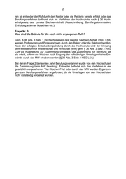 2 ren ist entweder der Ruf durch den Rektor oder die Rektorin bereits erfolgt oder das Berufungsverfahren befindet sich im Verfahren der Hochschule nach § 36 Hoch- schulgesetz des Landes Sachsen-Anhalt (Ausschreibung, Berufungskommission, Einholung externer Gutachten etc.). Frage Nr. 3: Was sind die Gründe für die noch nicht ergangenen Rufe? Gem. § 36 Abs. 3 Satz 1 Hochschulgesetz des Landes Sachsen-Anhalt (HSG LSA) werden Professoren und Professorinnen durch den Rektor oder die Rektorin berufen. Nach der erfolgten Entscheidungsfindung durch die Hochschule wird der Vorgang dem Ministerium für Wissenschaft und Wirtschaft (MW) gem. § 36 Abs. 3 Satz 2 HSG LSA vor Ruferteilung zur Zustimmung vorgelegt. Die Zustimmung zur Berufung gilt als erteilt, sofern vier Wochen nach Eingang der vollständigen Unterlagen keine Ein- wände durch das MW erhoben werden (§ 36 Abs. 3 Satz 3 HSG LSA). Bei den in Frage 2 benannten zehn Berufungsverfahren wurde von den Hochschulen die Zustimmung beim MW beantragt. Entweder befindet sich das Verfahren in der gesetzlich vorgesehenen Vier-Wochen-Frist oder durch das MW wurden Ergänzun- gen zum Berufungsverfahren angefordert, da die Unterlagen von den Hochschulen nicht vollständig vorgelegt wurden.