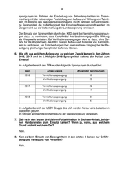 Landtag von Sachsen-Anhalt Drucksache 7/3228 09.08.2018 Antwort der Landesregierung auf eine Kleine Anfrage zur schrift- lichen Beantwortung Abgeordnete Henriette Quade (DIE LINKE) Einsatz von Sprengmitteln Kleine Anfrage - KA 7/1835 Vorbemerkung des Fragestellenden: Das Gesetz über die öffentliche Sicherheit und Ordnung des Landes Sachsen-Anhalt (SOG LSA) regelt in § 58 den unmittelbaren Zwang als eine Form der Einwirkung auf Personen oder Sachen durch körperliche Gewalt, durch ihre Hilfsmittel und durch Waffen. Hilfsmittel der körperlichen Gewalt sind insbesondere Fesseln, Wasserwerfer, techni- sche Sperren, Diensthunde, Dienstpferde, Dienstfahrzeuge, Reiz- und Betäubungs- stoffe sowie zum Sprengen bestimmte explosionsfähige Stoffe (Sprengmittel). In § 68 SOG LSA wird ferner geregelt, dass Sprengmittel nicht gegen Personen an- gewandt werden dürfen. Antwort der Landesregierung erstellt vom Ministerium für Inneres und Sport Vorbemerkung: Der parlamentarische Informationsanspruch ist grundsätzlich auf die Beantwortung gestellter Fragen in der Öffentlichkeit angelegt. Die Landesregierung hat allerdings alle Handlungen zu unterlassen, die dazu geeignet sein können, die Wirksamkeit po- lizeilicher Maßnahmen einzuschränken oder deren Erfolg zu gefährden. Die Antwort der Landesregierung muss insoweit teilweise als „Verschlusssache - Nur für den Dienstgebrauch“ eingestuft werden. Hierbei wird der Rechtsprechung des Landes- verfassungsgerichts Sachsen-Anhalt (LVerfG LSA) gefolgt, nach der bei der Erfül- Hinweis: Eine Einsichtnahme des vertraulichen Teils o. g. Antwort ist für Mitglieder des Landtages in der Landtagsverwaltung - Akteneinsichtnahmeraum - nach Terminabsprache möglich. (Ausgegeben am 09.08.2018)