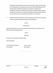 When Member States adopt those measures, they shall contain a reference to this Directive or be accompanied by such a reference on the occasion oftheir official publication. They shall also include a statement that references in existing laws, regulations and administrative provisions to the Directive(s) repealed by tbis Directive shall be construed as references to this Directive in case they are not updated. Member States shall determine how such reference is to be made and how that statement is to be formulated. 2. Member States shall communicate to the Commission the text of the main provisions of national law which they adopt in the field covered by this Directive. Article 4 Entry into force This Directive shall enter into force on the twentieth day following that of its publication in the Official Journal ofthe European Union. Article 5 Addressees This Directive is addressed to the Member States. Done at Strasbourg, For the European Parliament For the Council The President The President 1 5605/16 SS/mmf 48 DGG l B EN