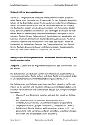Berufliches Gymnasium Zentralabitur Deutsch gA 2018 Die bekanntesten Lieder sind heute Bestandteil der Unterhaltungskultur geworden, weshalb sie ihre provozierende Wirkung verloren haben. Anforderungsbereiche II und III Bewertungskriterien für die Noten „gut“ und „ausreichend“ Die Note „gut“ verlangt – bei Schwerpunktsetzungen – die differenzierte und kompetente Erfüllung des Erwartungshorizonts, ohne jedoch auf Voll- ständigkeit der angesprochenen Aspekte zu beharren. Insbesondere die Aufgabe zwei gewährt den Prüflingen die Möglichkeit einer eigenständigen Schwerpunktsetzung, der bei der Beurteilung Rechnung zu tragen ist. Die sprachlich-stilistische Gestaltung der Arbeit muss flüssig, korrekt sowie verständlich und der Aufbau klar gegliedert, die Gedankenführung strin- gent sein. Für die Note „ausreichend“ genügt es, wenn unter Anwendung grundle- gender Verfahren, Begriffe und Argumentationstechniken die Fragestel- lungen und Sachverhalte im Ansatz treffend bearbeitet, richtig erfasst und wiedergegeben werden. Die Gedankengänge sollten nachvollziehbar ent- wickelt und verständlich formuliert sein. Der Aufbau muss erkennbar ge- ordnet, der Stil verständlich und die sprachliche Gestaltung weitgehend fehlerfrei sein. Seite 8 von 8 Sachtext erörternd (gA) Erwartungshorizont