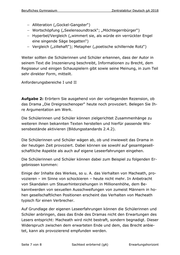 Berufliches Gymnasium Zentralabitur Deutsch gA 2018 Unterrichtliche Voraussetzungen Ab der 11. Jahrgangsstufe bildet die untersuchende Analyse pragmati- scher Texte einen thematischen Schwerpunkt. In den folgenden Kurshalb- jahren ist das Erschließen dieser Texte wiederkehrender Unterrichtsgegen- stand. Vor diesem Hintergrund sind die Lernenden vertraut im Umgang mit Sachtexten, wissen um das Zusammenspiel von rhetorischer Gestal- tung, Struktur, Intention und Wirkung und vermögen die Regeln der indi- rekten Rede zur Wiedergabe fremden Gedankenguts sachgerecht anzu- wenden. Darüber hinaus haben sie auch Kenntnisse zum Verständnis von Literatur erworben. Im Rahmen des Kernbereichs „Literarische Moderne zwischen Tradition und Postmoderne – Die Idee des Neuen“ haben die Lernenden am Beispiel des Dramas „Die Dreigroschenoper“ von Bertolt Brecht Texte im Zusammenhang von Entstehungszeit, Aussageabsicht, Wirkung und Gegenwartsbezug verglichen und beurteilt. Bezug zu den Bildungsstandards – erwartete Schülerleistung – An- forderungsbereiche Aufgabe 1: Geben Sie die Argumentationsstruktur des vorliegenden Tex- tes wieder. Die Schülerinnen und Schüler können den inhaltlichen Zusammenhang voraussetzungsreicher Texte sichern und diese Texte terminologisch präzi- se und sachgerecht zusammenfassen (Bildungsstandards 2.4.2). Die Schülerinnen und Schüler analysieren den Text inhaltlich und formal, indem sie ihn sachlich und inhaltlich richtig zusammenfassen, dabei seine Struktur herausarbeiten und exemplarisch Bezüge zur „Dreigroschenoper“ herstellen: − Überschrift und Einleitung beziehen sich auf den Inhalt des Schlus- ses − vier Sinnabschnitte mit jeweiliger Zwischenüberschrift − wertend („Ausgerechnet“; „manchmal ermüdend ewiggleiche“) − umgangssprachlich („junger Frechdachs“; „hingespuckte Lieder“) − Aufzählung („Bleiche Masken, viel Pantomime, starres Licht“; „ir- gendwelche nicht vorhandenen Türen schließen, unsichtbare Regale einräumen und eingebildete Knöpfe drücken“) Seite 6 von 8 Sachtext erörternd (gA) Erwartungshorizont