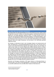 DER LANGE WEG ZUR INFORMATIONSFREIHEIT Die Vorgeschichte der Informationsfreiheit ist nur in Deutschland eine kurze. Andere Länder verfügen über eine echte Tradition von Informationszugangs- und Akteneinsichtsrechten der Bürgerinnen und Bürger gegenüber staatlichen Stellen. So verfügt Schweden bereits seit 1766 über einen gesetzlich geregelten Informationszugang zu Verwaltungsvorgängen, unab- hängig von der Betroffenheit und dem Ziel der Einsichtnahme von Seiten der Antragstellen- den. Hintergrund dieses Gesetzes war eine bis dato strikte Geheimhaltung durch staatliche Behörden sowie eine strenge Pressezensur, mit der bereits im 18. Jahrhundert gründlich aufgeräumt wurde. Der Freedom of Information Act gilt in den Vereinigten Staaten von Amerika bereits seit 1967. Die Bürgerrechts- und Demokratiebewegung der 60er Jahre in den USA hat sich be- sonders für die Informationsfreiheit eingesetzt. Der Kongress erkannte, dass die Bürger ein „right to know“ haben, um von ihren Bürgerrechten effektiv Gebrauch machen zu können. Daraufhin erließ der Kongress 1966 das bahnbrechende Informationsfreiheitsgesetz der USA, den „Freedom of Information Act“ (FOIA). Der FOIA verpflichtet, ähnlich wie das LIFG, staat- liche Verwaltungsstellen allen Bürgern den Zugang zu vorhandenen Informationen zu ge- währen. Dabei kennt die amerikanische Regelung, wie das LIFG, Schutzvorschriften, bei de- ren Vorliegen ein Anspruch auf Informationszugang abzulehnen ist. Neben der Möglichkeit bei Ablehnung des Informationszugangs Widerspruch einzulegen und zu klagen, sieht der FOIA zudem Strafen für eine vorsätzliche ungerechtfertigte Vereitelung eines Informations- zugangs vor. Der FOIA ist weltweit bekannt geworden, weil auf seiner Grundlage immer wie- der wichtige Informationen über das Handeln amerikanischer Behörden an die Öffentlichkeit 4 gelangt sind, die zum Teil heftige öffentliche Debatten auslösten . Dänemark und Norwegen entwickelten 1970 eigene Gesetze zur Informationsfreiheit, in Frankreich gibt es seit 1978 ein Aktenzugangsgesetz, in Griechenland seit 1986 und in Belgi- 5 en seit 1994. Großbritannien hat seit 2005 seinen Freedom of Information Act . 4 Vgl. hierzu https://www.foia.gov/ 5 Vgl. hierzu https://ico.org.uk/ 2