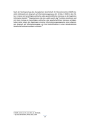 Nach der Rechtsprechung des Europäischen Gerichtshofs für Menschenrechte (EGMR) be- steht mittlerweile ein Anspruch auf Informationszugang aus Art. 10 Abs. 1 EMRK in den Fäl- len, in denen ein berechtigtes politisches oder gesellschaftliches Interesse an der begehrten 32 Information besteht. Organisationen, die eine „public watch dog“-Funktion einnehmen und mit ihrem Antrag ein berechtigtes politisches oder gesellschaftliches Interesse verfolgen, haben daher neben den Regelungen einzelner Informationszugangsgesetze einen allgemei- nen Anspruch auf Informationszugang, um ihre Kontrollfunktion in einer demokratischen 33 Gesellschaft wirksam ausüben zu können. 32 EGMR, Urteil vom 25. Juni 2013, Az. 48135/06. 33 Vgl. dazu Brink/Wirtz, NVwZ 2015, 1166 20