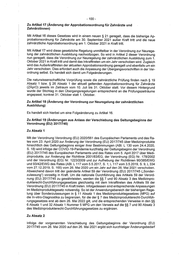 - 100 - Zu Artikel 17 (Anderung der Approbationsordnung fiir Zahnarzte und Zahnarztinnen) Mit Artikel. 16 dieses Gesetzes wird in einem neuen § 21 geregelt, dass die bisherige Ap- probationsordnung fur Zahnarzte am 30. September 2021 au@er Kraft tritt und die neue zahnarztliche Approbationsordnung am 1. Oktober 2021 in Kraft tritt. Mit Artikel 17 wird diese gesetzliche Regelung unmittelbar in der Verordnung zur Neurege- lung der zahnarztlichen Ausbildung nachvollzogen. So wird in Artikel 2 dieser Verordnung nun geregelt, dass die Verordnung zur Neuregelung der zahnarztlichen Ausbildung zum 1. Oktober 2021 in Kraft tritt und damit das Inkrafttreten um ein Jahr verschoben wird. Zugleich wird das AuBerkrafttreten der aktuellen Approbationsordnung geregelt und ebenfalls um ein Jahr verschoben. Dies erfordert auch die Anpassung der Ubergangsvorschriften in der Ver- ordnung selbst. Es handelt sich damit um Folgeanderungen. Die naturwissenschaftliche Vorpriifung sowie die zahnarztliche Priifung finden nach § 19 Absatz 1 bzw. § 26 Absatz 1 der aktuell geltenden Approbationsordnung fir Zahnarzte -(ZAprO)jeweils im Zeitraum vom 10. Juli bis 31. Oktober statt. Vor diesem Hintergrund wurde der Stichtag in den Ubergangsregelungen entsprechend an die Priifungszeitraume angepasst, konkret 31. Oktober statt 1. Oktober. Zu Artikel 18 (Anderung der Verordnung zur Neuregelung der zahnarztlichen Ausbildung) Es handelt sich hierbei um eine Folgeanderung zu Artikel 16. Zu Artikel 19 (Anderungen aus Anlass der Verschiebung des Geltungsbeginns der Verordnung (EU) 2017/745) Zu Absatz 1 Mit der Verordnung Verordnung (EU) 2020/561 des Europdischen Parlaments und des Ra- tes vom 23. April 2020 zur Anderung der Verordnung (EU) 2017/745 Uber Medizinprodukte hinsichtlich des Geltungsbeginns einiger ihrer Bestimmungen (ABI. L 130 vom 24.4.2020, S. 18) wird infoige der COVID-19-Pandemie kurzfristig der Geltungsbeginn der Verordnung (EU) 2017/745 des Europdischen Parlaments und des Rates vom 5. April 2017 Uber Medi- zinprodukte, zur Anderung der Richtlinie 2001/83/EG, der Verordnung (EG) Nr. 178/2002 und der Verordnung (EG) Nr. 1223/2009 und zur Aufhebung der Richtlinien 90/385/EWG und 93/42/EWG des Rates (ABI. L 117 vom 5.5.2017, S. 1; 117 vom 3.5.2019, S. 9, L 334 vom 27.12.2019, S. 165) vom 26. Mai 2020 um ein Jahr auf den 26. Mai 2021 verschoben. Abweichend davon tritt der geanderte Artikel 59 der Verordnung (EU) 2017/745 (,,Sonder- zulassung") vorzeitig in Kraft. Um die nationale Durchfihrung des Artikels 59 der Verord- nung (EU) 2017/745 zu gewahrieisten, werden die §§ 7 und 90 Absatz 3 des Medizinpro- dukterecht-Durchfilhrungsgesetzes gleichzeitig mit dem Inkrafttreten des Artikels 59 der Verordnung (EV) 2017/745 in Kraft treten. Infoigedessen sind entsprechende Anpassungen im Medizinproduktegesetz notwendig. So ist der Anwendungsbereich der bisherigen Rege- lung Gber Sonderzulassungen in § 11 Absatz 1 des Medizinproduktegesetzes (MPG) auf die In-vitro-Diagnostika zu begrenzen, fiir die der § 7 des Medizinprodukterecht-Durchfth- rungsgeseizes erst ab dem 26. Mai 2022 gilt, und die entsprechenden Verweise in den §§ 6 Absatz 1 und 32 Absatz 1 Nummer 5 MPG um den Verweis auf die §§ 7 und 90 Absatz 3 des Medizinprodukterecht-Durchfilhrungsgesetzes zu erganzen. Zu Absatz.2 Infolge der des Geltungsbeginns der vorgenannten Verschiebung Verordnung (EU) 2017/745 vom 26. Mai 2020 auf den 26. Mai 2021 ergibt sich kurzfristiger Anderungsbedarf