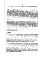 - 88 - rem Vorschlag den betrieblichen Geltungsbereich der aktuellen Verordnung Uber zwin- gende Arbeitsbedingungen in der Pflegebranche Zugrunde gelegt. Sie schlagen fur eine Staffelung einer Sonderleistung an Beschaftigte in Zeiten der Corona-Pandemie vor allem die ,Nahe* der jeweiligen Pflege- und Betreuungstatigkeit zum Pflegebediirftigen vor. Die Pramie soll auch Sicht der Kommissionsmitglieder als individueller steuer- und-sozial- versicherungsfreier Anspruch der Beschaftigten ausgestaltet werden. Insgesamt sollen nach den Vorschlagen der ehemaligen Mitglieder der Pflegekommission fur Beschaftigte in der direkten Pflege und Betreuung (bei jeweils mindestens 35 Arbeits- stunden/Woche) 1.500 Euro, fiir mindestens im Umfang von 25 Prozent der Arbeitszeit in diesen Bereichen eingesetzte Beschaftigte 1.000 Euro und fur die Ubrigen Beschaftigten der Pflegeeinrichtung 500 Euro Bonus gezahit werden. Furr Auszubildende in der Pflege wird ein Bonus von 900 Euro vorgeschlagen. Eine Erhéhungder Eigenbeteiligung der Pflegebedirrftigen oder ihrer Angehérigensei grunds€atzlich nicht vertretbar. Aus Sicht der Kommissionsvertreter bietet sich eine alleinige Finanzierung aus Mitteln der Pflegeversicherung vor dem Hintergrund der gesamtgesell- schaftlichen Aufgabe nicht an. Der vorliegende Gesetzentwurf sieht eine Corona-Pramie entlang der grundsatzlichen Vor- schlage der Mitglieder der ehemaligen Pflegekommission vor. Zu Absatz 1 Eine besondere Belastung flr Beschaftigte in Pflegeeinrichtungen ergibt sich aus dem re- gelmaRigen und unmittelbaren Kontakt mit zur Hochrisikogruppe zahlenden oder bereits an Covid-19 erkrankten Pflegebedirftigen. Diese resultieren in besonderem Umfang aus spe- ziell auf die Pflege zugeschnittenen amtlichen Vorgaben (Bundes- und Landesgesetze und -verordnungen, Verfligungen) und verandern tiefgreifend die Inhalte der Arbeit, bspw. im Hinblick auf kérperbezogene Pflege und Betreuung in besonders distanzierender Schutz- kleidung oder die Kompensation der aktuell kaum moglichen Einbeziehung Angehdoriger auch in schweren Lebensphasen und der Sterbebegleitung. Die Beschéaftigten erhalten daher einen Rechtsanspruch auf die Corona-Pramie nach Ma&- gabe der Absatze 2 bis 6. Jeder Beschaftigte und jede Beschéaftigte erhalt die Pramie nur einmal, unabhangig davon ob er oder sie im Bemessungszeitraum bei mehr als einer Pfle- geeinrichtung bzw. mehr als einem Arbeitgeber tatig ist. Erfasst werden alle Besch€aftigten einschlieBlich aller. Mitarbeitenden, die etwa im Wege eines Werk- oder Dienstleistungsvertrags oder einer fir Arbeitnehmertberlassung die Pflege und Betreuung in den Einrichtungen eingesetzt werden, die in nach dem Elften Buch zugelassenen teil- und voilstationaren Pflegeeinrichtungen sowie fur ambulante Pflege- diensten einschlieRlich Betreuungsdiensten nach § 71 Absatz 1a SGB XI tatig sind. Zu den Beschaftigten gehéren auch geringfiigig Beschaftigte oder Auszubildende ' in der Pflege so- wie Helferinnen und Heifer im freiwilligen sozialen Jahr und Bundesfreiwilligendienstleis- tende. Zu Absatz 2 Die Sonderleistung ist fur Beschaftigte zu zahlen, die zwischen dem 1. Marz 2020 und dem 31. Oktober 2020 (sog. Bemessungszeitraum) mindestens drei Monate in der Pflegeein- richtung tatig bzw. im Bereich der Pflege und Betreuung oder sonstigen Bereichen einge- setzt sind. Nach Nummer 1 erhalten eine Pramie in Héhe von 1.000 Euro alle Beschaftigten, die schwerpunktmakig in der direkten Pflege und Betreuung arbeiten. Dies sind insbesondere