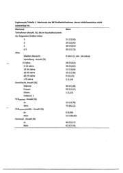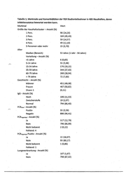 Tabelle 1. Merkmale und Komorbiditäten der 919 Studienteilnehmer in 405 Haushalten, deren Infektionsstatus bewertet werden kann. Merkmal Wert Größe der Haushaltscluster- Anzahl (%) 1 Pers. 98 (24,20) 2 Pers. 184 (45,43) 3 Pers. 59 (14,57) 4 Pers. 49 (12,10) 5 Personen oder mehr 15 (3,70} Alter Median (Bereich) 53 Jahre (1 Jahr- 90 Jahre) Verteilung- Anzahl (%) <5 Jahre 6 (0~65} ..- .. 5-14 Jahre 55 (5,98) 15-34 Jahre 176 (19,15) 35-59 Jahre 344 (37,43) 60-79 Jahre 266 (28,94) > 79Jahre 72 (7,83} Geschlecht_..:. Anzahl (%) Männer 451 {49,08} Frauen 467 {50,82} Divers 1 (0,11) lgG -Anzahl {%) Hoch 106 (11,53) Zwischenstufe 19 (2,07) Normal 794 (86,40) PCRnew- Anzahl(%) Positiv 33 (3,59) Negativ 886 (96,41) PCRreported- Anzahl (%) Ja 117 (12,79) Nein 796 (86,99) Nicht bekannt 2 {0,22) Fehlend: 4 PCRreported Positiv- Anzahl {%) Ja 22 (18,97) Nein 93 (80,17) Nicht bekannt 1 (0,86) Fehlend: 1 Lungenerkrankung- Anzahl (%) Ja 107 (1,67) Nein 798 (87,02)