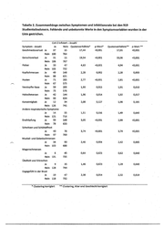 Tabelle 2. Zusammenhänge zwischen Symptomen und Infektionsrate bei den 919 Studienteilnehmern. Fehlende und unbekannte Werte in den Symptomvariablen wurden in der Liste gestrichen. CoV-2 infiziert -Anzahl Symptom -Anzahl Ja Nein Quotenverhältnis* p-Wert* Qu otenverhä ltn is ** p-Wert ** Geschmacksverlust Ja 37 15 17,44 <0,001 17,01 <0,001 Nein 100 764 Geruchsverlust Ja 31 11 19,54 <0,001 19,06 <0,001 Nein 106 767 Fieber Ja 33 47 4,63 <0,001 4,94 <0,001 Nein 105 732 Kopfschmerzen Ja 49 148 2,28 0,002 2,28 0,003 Nein 88 631 Husten Ja 71 205 2,77 <0,001 2,81 <0,001 .~. Nein 67 575 Verstopfte Nase Ja 59 205 1,90 0,013 1,91 0,010 Nein 75 576 Halsschmerzen Ja 42 144 1,96 0,014 1,92 0,017 Nein 93 634 Kurzatmigkeit Ja 12 34 2,08 0,127 1,98 0,191 Nein 126 741 Andere respiratorische Symptome Ja 14 55 1,51 0,556 1,49 0,640 Nein 121 716 Ers€höpfung Ja 59 148 3,05 <0,001 2,99 <0,001 Nein 78 633 Schwitzen und Schüttelfrost Ja 40 76 3,74 <0,001 3,74 <0,001 Nein 97 700 Muskel- und Gelenkschmerzen .·-. Ja 34 90 2,46 0,004 2,42 0,005 Nein 103 688 Magenschmerzen Ja 6 45 0,64 0,623 0,62 0,640 Nein 131 735 Übelkeit und Erbrechen Ja 9 35 1,46 0,623 1,29 0,640 Nein 128 744 Engegefühl in der Brust Ja 19 47 2,38 0,014 2,32 0,019 Nein 118 732 * Clustering korrigiert *"' Clustering, Alter und Geschlecht korrigiert