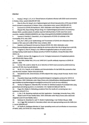 Literatur 1. Huang c, Wang V, Li X, et al. Clinical features of patients infected with 2019 novel coronavirus in Wuhan, China. Lancet 2020;395:497-506. 2. Chen N, Zhou M, Dang X, et al. Epidemiological and clinical characteristics of 99 cases of 2019 novel coronavirus pneumonia in Wuhan, China: a descriptive study. Lancet 2020;395:507-13. 3. Coronavirus (COVID-19) Dashboard; 2020. (Gefunden unter https://covid19.who.int.) 4. Shujuan Ma, Jiayue Zhang, Minyan Zeng, et al. Epidemiological parameters of coronavirus disease 2019: a pooled analysis of publicly reported individual data of 1155 cases from seven countries. medRxiv 2020032120040329; doi: https://doiorg/101101/2020032120040329 2020. 5. Lavezzo E, Franchin E, Ciavarella C, et al. Suppression of COVID-19 outbreak in the municipality ofVo, ltaly. 2020. 6. Bi Q, Wu V, Mei S, et al. Epidemiology and Transmission of COVID-19 in Shenzhen China: Analysis of 391 cases and 1,286 oftheirclose contact~. 2020. 7. Statistics and Research Coronavirus Disease (COVID-19}. 2020. (Gefunden unter (https://ourworldindata.org/coronavirus#what-do-we-know-about-the-risk-of-dying-from-covid-19}. 8. Vongehen Z, Shen H, Wang X, et aL Different longitudinal patterns of nucleic acid and serology testing results based on disease ~everity of COVID-19 patients. Ernerg Microbes lnfect 2020:1-14. 9. Wolfe! R, Corman VM, Guggemos W, et al. Virological assessment of hospitalized patients with COVJD-2019. Nature 2020. 10. Okba NMA, Muller MA, Li W, et al. SARS-CoV-2 specific antibody responses in COVID-19 patients. 2020. 11. Corman VM, Landt 0, Kaiser M, et al. Detection of 2019 novel coronavirus (2019-nCoV) by real-time RT-PCR. Euro Surveill 2020;25. 12. Ge 'X:(, Li JL, Yang XL, et al. Isolation and characterization of a bat SARS-like coronavirus that uses the ACE2 receptor. Nature 2013;503:535-8. 13. Ramakrishnan MA. Deterrriination of 50% endpoint titer using a simple formula. World J Virol 2016;5:85-6. 14. Population-based age-stratified seroepidemiological investigation protocol for COVID-19 virus infection. 2020. (Gefunden unter https://www.who.int/publications-detail/population-based- age-stratified-seroepidemiological-investigation-protocol-for-covid-19-virus-infection.) 15. Hanley JA, Negassa A, Edwardes MD, Farrester JE. Statistkai analysis of correlated data using generalized estimating equations: an orientation. Am J Epidemiol2003;157:364-75. 16. Rogan WJ, Gladen B. Estimating prevalence from the results of a screening test. Am J Epidemiol1978;107:71-6. 17. C. DA, V. HD. Bootstrap methods and their application.: Cambridge University Press; 1978. 18. Global Covid-19 Case Fatality Rates. 2020. (Gefunden unter https://www.cebm.net/covid- 19/global-covid-19-case-fatality-rates.) 19. Rothman KJ, Greenland S, Lash TL. Modern Epidemiology. 3 ed: Wolters Kluwer; 2008. 20. Liu Y, Eggo RM, Kucharski AJ. Secondary attack rate and superspreading events for SARS-CoV- 2. Lancet 2020;395:e47. 21. Al-Tawfiq JA, Rodriguez-Morales AJ. Super-spreading events and contribution to transmission of MERS, SARS, and COVID-:1.9; J Hosp lnfect 2020. 16