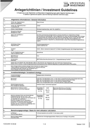 —— UNIVERSAL nd INVESTMENT Anlagerichtlinien / Investment Guidelines In Ergänzung zu den Allgemeinen und Besonderen Anlagebedingungen gelten folgende Vereinbarungen: / In addition to general and specific rules the following investment restrictions apply: 1. Allgemeine Informationen / General Information 11. Fonds- bzw. Segmentname / Elbe-Ul-Fonds Name of fund/portfolio 1.2. Fonds- bzw. Segmentnummer / 570801 Fund/portfolio ID 1.3. Advisor / Asset Manager Universal-Investment-Ges. mbH Ffm -QUANTS- | 1.4. Management Mandat / Q-Mandat Management model 1.5. Datum des Inkrafttretens / Die KVG versendet diese Anlagerichtlinien vorab per Email/Fax zur Unterschrift an Anleger, Effective as of Verwahrstelle und Asset Manager. Diese Anlagerichtlinien treten zwei Bankarbeitstage nach Vorliegen der Unterschriften aller Parteien auf der per Email/Fax versendeten Version in Kraft. Das Datum des Inkrafttretens wird durch die KVG per Email kommuniziert. Das Datum des Inkrafttretens wird entsprechend auf den in Papierform zu unterzeichnenden und per Post versendeten Anlagerichtlinien ergänzt. 1.8. Gesetzesgrundlage / Kapitalanlagegesetzbuch / Regulatory basis Capital Investment Act Fondsart / KAGSB - offener inländischer Spezial-AIF mit festen Anlagebedingungen (alle Anlagemöglichkeiten) Type 1.8. Art der Anlagebedingungen / Spezialfonds Type of investment rules 1.9. Basiswährung / Euro Base currency 1.10. Verwahrstelle / BNP Paribas Securities Services $.C.A. - Zweigniederlassung Frankfurt Depositary 1.11. Weder KVG noch Berater oder Asset Manager haften für das Erreichen der Anlageziele oder einer bestimmten Wertentwicklung. / u N Neither KVG nor advisor or asset manager guarantee the achievement of the investment objectives or a certain performance of the portfolio. | 1.12. Diese Anlagerichtlinien ersetzen etwaige frühere Versionen für diesen Fonds. / These Investment Guidelines shall replace any prior version for this fund. Zukünftige Änderungen bedürfen der schriftlichen Form. / Future changes will require the written form. I 2. Investmentstrategie / Investment strategy 2.1. Investmentstrategie / regelgebundener Rentenfonds investment strategy 2.2. Benchmark / E1XS 30% (The BofA Merrill Lynch 1-3 Year AAA-A Corporate Excluding Subordinated Debt Index) Benchmark EG6Y 30% (The BofA Merrill Lynch 0-3 Year AAA-AA All Euro Government Index) EP61 30% (The BofA Merrill Lynch 1-3 Year AAA Euro Pfandbrief Index) GODC 10% (The BofA Merrill Lynch 1imos-Smos German Treasury Bill Index) 2.3. Risikomanagementansatz / Einfacher Ansatz / Commitment approach Risk management approach 2.4. Marktrisikolimit: Einfacher Ansatz / Anwendbar / Limit Maximales Marktrisiko aus Derivaten / Market risk limit: commitment approach Applicable Max (%) Maximum market risk from derivatives ax (70 Ja/\Yes 100,00 2.5. Maximal zulässiges Risiko nach Brutto-Methode Anwendbar ’/ Limit (Hebelfinanzierung) nach Art. 6 bis 11 der Applicable 0 Verordnung (EU) Nr. 231/2013 der Kommission vom |), /y, Max (%) ' 19. Dezember 2012 (AIFM-VO). / alyes 150.00 Maximum leverage of the AlF calculated in ' accordance with the gross method as set out in articles 6 to 11 ofthe commission delegated regulation (EU) No. 231/2013 of 19 December 2012 supplementing Directive 2011/61/EU. 3. Berechnungsgrundlage / Basis for limit utilization calculation 3.1. Limitbezug / %-Grenze beziehen sich auf NAV / % limit refers to NAV The limit check refers to 3.2. Berechnungsgrundlage / Marktwerte der Vermögensgegenstände / Market price of holdings in the portfolio Calculation basis 12.02.2015 12:33:42 1-6 Version 1.0.0