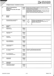 —— SMNIVEMH>SAL ud INVESTMENT 4.2.3.2.1. 4.2.3.3. 4.2.3.4. 4.2.3.5, 4.2.3.7, 4.2.3.8. 4.2.3.9, 4.2.3.10, 4,2.3.11. 4.2.3.12. 4.2.3.13. 4.2.3.14. 4.2.3.15. Variabel verzinsliche Anleihen / Fioater Variabel verzinsliche Anleihen (Standard) / Floating rate notes (standard) Nullkuponanleihen (Zerobonds) / Zero (coupon) bonds Anleihen mit Kündigungs-/Tilgungsrechten / Callable/puttable/sinkable bonds (Dies beinhaltet nicht Anleihen mit Steuer- Kündigungsrechten / this doesn't include bonds with tax call features) Anleihen mit Step-Kupon / Bonds with step coupon Fix-to-Float Bonds / Fix to float bonds Anleihen mit ratingabhängigem Kupon / Bonds with rating-linked coupon Genußrechte/-scheine (Rentencharakter) / Participation certificates (with bond character) Units rentenähnlich / Units with bond character Doppelwährungsanleihen / Dual currency bonds Inflationsindizierte Anleihen / Inflation linked bonds Commercial Papers / Commercial papers Certificates of Deposit / Certificates of deposit Asset Backed Securities / Asset backed securities Mortgage Backed Securities (RMBS/CMBS) / Mortgage backed securities (RMBS/CMBS) Zulässig / Allowed Ja/Yes Zulässig / Allowed Jal/Yes Zulässig / Allowed Ja/Yes Zulässig / Allowed Ja/\Yes Zulässig / Allowed Ja/Yes Zulässig / Allowed Ja/Yes Zulässig / Allowed Ja/\Yes Zulässig / Allowed Nein /No Zulässig / Allowed Nein /No Zulässig / Allowed Nein /No Zulässig / Allowed Nein /No Zulässig / Allowed Ja/Yes Zulässig / Allowed Nein /No Zulässig / Allowed Nein /No Zulässig / Allowed Nein /No Hinweis / Note: Anleihen mit Steuer-Kündigungsrechten gelten im Sinne dieser Anlagerichtlinie als Standard-Rentenart. / Bonds with tax call features are deemed to be standard bond typ w.r.t. this investment guidelines. Ul-Definition: Bei Units handelt es sich um eine Klasse von Wertpapieren, die sich individuell aus einer Kombination anderer Wertpapiere ergeben. / Ul-definition: A unit is a financial instrument which is comprised of two or more classes of securities traded together as one security. Nur qualifizierter Ansatz / Oniy qualified approach 12.02.2015 12:33:42 3-6 Version 1.0.0