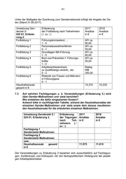 41 Unter der Maßgabe der Zuordnung zum Gendernebenziel erfolgt die Angabe der Da- ten (Stand 31.08.2017): Umsetzung Gen- Erläuterung 2017 2018 derziel 2/ der Fortbildung nach Teilnehmern Ansätze Ansätze 525 01, Erläute- (♂ zu ♀) in € in € rung 2. Fortbildung 1 Führungskompetenz … AFI ca. 1-0 80,00 Fortbildung 2 Personalauswahlverfahren AFI ca. 0-1 55,00 Fortbildung 3 Grundlagen MA-Führung AFI ca. 1-0 80,00 Fortbildung 4 Burn-out-Prävention f. Führungs- AFI ca. kräfte 55,00 1-0 Fortbildung 5 Arbeitsrechtsseminare Dialog zu Qualifiziergs.vereinb., etc. WB 0-2 350,00 Fortbildung 6 Rhetorik von Frauen und Männern in Führungspos. 0-1 Haushaltsansatz 15.275 15.235 gesamt in € 7.3 Auf welchen Fachtagungen u. ä. Veranstaltungen (Erläuterung 3.) wird über Gender-Maßnahmen und -ziele berichtet? Wie entstehen die dafür eingeplanten Kosten? Antwort bitte in nachfolgender Tabelle: anhand der Haushaltsansätze der einzelnen Gender-Maßnahmen und -ziele sowie dem daraus resultieren- den Haushaltsansatz für die erläuterten einzelnen Maßnahmen. Umsetzung Genderziel 2 / Erläuterung 2017 2018 525 01, Erläuterung 3. der Tagungen Ansätze Ansätze nach Teil- in € in € nehmern (♂ zu ♀) Fachtagung 1 Genderziele/-Maßnahmen Fachtagung 2 Genderziele/-Maßnahmen usw. Haushaltsansatz gesamt 11.575 11.615 in € Die Veranstaltungen zu Erläuterung 3 beziehen sich ausschließlich auf Fachtagun- gen, Konferenzen und Kolloquien mit rein fachspezifischem Hintergrund der jeweili- gen Arbeitsplatzinhaber.