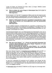 44 Jungen die Werte und Schönheit der Natur näher zu bringen. Mittelbar werden dadurch auch Genderziele umgesetzt. 9.2 Warum erhalten die Junior Ranger im Nationalpark Harz (15 10, 532 71) keine Gender-Förderung? Bitte begründen. Die bei Kapitel 15 10 Titel 532 71 eingeplanten Mittel wurden bei der Zusammenstel- lung der genderrelevanten Haushaltsansätze nicht berücksichtigt. Die Finanzierung der Junior Ranger erfolgt länderübergreifend und somit nur anteilig durch LSA. 9.3 Werden im Nationalpark Harz keine Jugendlichen eingesetzt bzw. ausge- bildet, die im Rahmen der Chancengleichheit unter die Genderzielset- zungen fallen? Bitte begründen. Es sind vielfältige Angebote und Möglichkeiten für Jugendliche zur Mitwirkung im Na- tionalpark Harz vorhanden: Commerzbank Umweltpraktikum, Freiwillige im FÖJ und im Bundesfreiwilligendienst, Projekt Wildtierbotschafter/Wildtierbotschafterin für Juni- orranger+ (Juniorranger ab 14 Jahre). Geschlechtergerechtigkeit wird in der Bildungsarbeit des Nationalparks Harz als ein Querschnittsziel verfolgt (vergleichbar dem Nachhaltigkeitsgedanken). Entsprechend findet dieses Ziel im Dreiklang aus jedem gewählten Bildungsinhalt, jeder angewand- ten Methode und jeder vermittelten Kompetenz Berücksichtigung. Darüber hinaus wird es in der allgemeinen Öffentlichkeits- und Informationsarbeit des Nationalparks Harz berücksichtigt (Fotos, Sprache etc.). Bildungs-Maßnahmen, die sich ausschließ- lich Genderzielen verschreiben, sind nicht Bestandteil des Leistungsspektrums des Nationalparks Harz. 9.4 Wie viele Junior Ranger (♂ zu ♀) können als dauerhafte Unterstützer den einzelnen Naturlandschaften des Junior Ranger Programms im Land- Sachsen-Anhalt zugeordnet werden? Bitte die Entwicklung der Anzahl der Junior Ranger (♂ zu ♀) seit Teil- nahmebeginn der einzelnen Naturlandschaft des Landes Sachsen-Anhalt am Junior Ranger-Programm zuordnen. Das Junior Ranger Programm im Biosphärenreservat Mittelelbe läuft seit 2007, an- fangs mit 2 AG Leiter mit je 1 JR AG. Aktuell betreuen 8 AG Leiter 21 JR AG`s. Bereits 320 Mädchen und 345 Jungen haben das Programm erfolgreich durchlaufen. Zurzeit sind 68 Mädchen und 109 Jungen als JR aktiv. Davon 2 Mädchen und 5 Jun- gen als JR+. Das sind JR die schon länger im Programm mit dabei sind und ein Alter ab 14 Jahren haben. Diese werden bereits selbst zur Unterstützung bei der AG Ar- beit mit herangezogen. Im Jahr 2017 unterstützen 50 männliche und 61 weibliche Junior Ranger das Bio- sphärenreservat Karstlandschaft Südharz. Die Entwicklung der Anzahl der Junior Ranger (♂ zu ♀) seit Teilnahmebeginn des Biosphärenreservat Karstlandschaft Süd- harz ist als Anlage 4 beigefügt. Im Nationalpark Harz sind aktuell 21 Mädchen und 28 Jungen als Juniorranger aktiv.