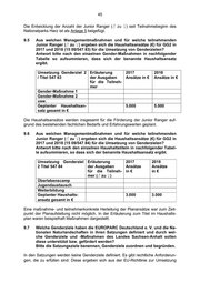 45 Die Entwicklung der Anzahl der Junior Ranger (♂ zu ♀) seit Teilnahmebeginn des Nationalparks Harz ist als Anlage 5 beigefügt. 9.5 Aus welchen Managementmaßnahmen und für welche teilnehmenden Junior Ranger (♂ zu ♀) ergeben sich die Haushaltsansätze (€) für GG2 in 2017 und 2018 (15 09/547 83) für die Umsetzung von Genderzielen? Antwort bitte nach den einzelnen Gender-Maßnahmen in nachfolgender Tabelle so aufsummieren, dass sich der benannte Haushaltsansatz ergibt. Umsetzung Genderziel 2 Erläuterung 2017 2018 / Titel 547 83 der Ausgaben Ansätze in € Ansätze in € für die Teilneh- mer Gender-Maßnahme 1 Gender-Maßnahme 2 usw. Geplanter Haushaltsan- 5.000 5.000 satz gesamt in € Die Haushaltsansätze werden insgesamt für die Förderung der Junior Ranger auf- grund des bestehenden fachlichen Bedarfs und Erfahrungswerten geplant. 9.6 Aus welchen Managementmaßnahmen und für welche teilnehmenden Junior Ranger (♂ zu ♀) ergeben sich die Haushaltsansätze (€) für GG2 in 2017 und 2018 (15 09/547 84) für die Umsetzung von Genderzielen? Antwort bitte nach den einzelnen Haushaltstiteln in nachfolgender Tabel- le aufsummieren, so dass sich der benannte Haushaltsansatz ergibt. Umsetzung Genderziel Erläuterung 2017 2018 2 Titel 547 84 der Ausgaben Ansätze Ansätze für die Teilneh- in € in € mer (♂ zu ♀) Überlebenscamp Jugendaustausch Weiterbildung Geplanter Haushalts- 3.000 3.000 ansatz gesamt in € Eine maßnahme- und teilnehmerkonkrete Herleitung der Planansätze war zum Zeit- punkt der Planaufstellung nicht möglich. In der Erläuterung zum Titel im Haushalts- plan waren beispielhaft Maßnahmen dargestellt. 9.7 Welche Genderziele haben die EUROPARC Deutschland e. V. und die Na- tionalen Naturlandschaften in ihren Satzungen definiert und durch wel- che Genderziele und -Maßnahmen des Landes Sachsen-Anhalt sollen diese unterstützt bzw. gefördert werden? Bitte die Satzungsziele benennen, Genderziele zuordnen und begründen. In den Satzungen werden keine Genderziele definiert. Es gibt rechtliche Anforderun- gen, die zu erfüllen sind: Diese ergeben sich aus der EU-Richtlinie zur Umsetzung
