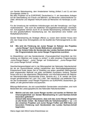 46 von Gender Mainstreaming, dem Amsterdamer Vertrag (Artikel 2 und 3) und dem Grundgesetz (Artikel 3). Bei allen Projekten ist es EUROPARC Deutschland e. V. ein besonderes Anliegen auf die Gleichstellung von Frauen und Männern, auf Menschen unterschiedlicher so- zialer, ethnischer und religiöser Herkunft sowie auf Menschen mit Handicaps zu ach- ten. Für die Umsetzung der rechtlichen Anforderungen sind alle Verwaltungs- und Orga- nisationsebenen - also auch die staatlichen Schutzgebietsverwaltungen verantwort- lich. Schutzgebiete nehmen durch ihr an Gender Mainstreaming orientiertes Verhal- ten eine gesellschaftliche Verantwortung war. Sie übernehmen eine Vorbild- und Multiplikatorenfunktion. Gender Mainstreaming als Strategie offensiv zu nutzen dient darüber hinaus dem Ziel, das Image eines Schutzgebiets und die Qualität des Parkmanagements zu stei- gern. 9.8 Wie wird die Förderung der Junior Ranger im Rahmen des Projektes „Junior-Ranger“ durch Gender-Maßnahmen unterstützt? Bei der Antwort bitte die Genderziele des Landes Sachsen-Anhalt zu den vier Programmsäulen des Junior Ranger Programmes zuordnen. Im Wesentlichen wird das Genderoberziel „Chancengleichheit hinsichtlich der Ent- wicklung von Mädchen und Jungen zu sichern“ in allen einzelnen Programmsäulen „Junior-Ranger-Region“, „Junior Ranger auf Entdeckertour“, „Junior-Ranger-Web“ und „Junior-Ranger-Schule“ verfolgt. Geschlechtergerechtigkeit wird in der Bildungsarbeit der Nationalen Naturlandschaf- ten als ein Querschnittsziel verfolgt (vergleichbar dem Nachhaltigkeitsgedanken). Entsprechend findet dieses Ziel im Dreiklang aus jedem gewählten Bildungsinhalt, jeder angewandten Methode und jeder vermittelten Kompetenz Anklang. Darüber hinaus wird es in der allgemeinen Öffentlichkeits- und Informationsarbeit der Nationa- len Naturlandschaften berücksichtigt (Fotos, Sprache etc.). Z. B. werden die Einla- dungen gendersensibel mit „Lars“ und „Lotta“, den männlichen und weiblichen Figu- ren des bundesweiten Junior Ranger Programms von EUROPARC Deutschland, ge- staltet, um alle gleichermaßen anzusprechen. Bildungs-Maßnahmen, die sich ausschließlich Genderzielen verschreiben, sind nicht Bestandteil des Leistungsspektrums des Nationalen Naturlandschaften. 9.9 Welche und wie viele Junior Ranger wurden und werden im Rahmen der Chancengleichheit von Gender Mainstreaming im Land Sachsen-Anhalt besonders gefördert? Antwort bitte darauf fokussieren, dass sich das Junior Ranger Programm an alle Kinder richtet: Bei Antwort bitte die Teilnehmerzahlen (♂ zu ♀) in den einzelnen Projekten und Junior Ranger-Treffen seit 2008 listen und besondere Förderung nach Genderzielen des Landes Sachsen-Anhalt begründen. Hierzu liegen dem MULE keine Erkenntnisse vor.