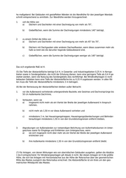 2. zu einem Drittel die Höhe von a) Dächern und Dachteilen mit einer Dachneigung von mehr als 45°, b) Dächern mit Dachgauben oder anderen Dachaufbauten, wenn diese zusammen mehr als halb so breit wie die Wand sind, c) Giebelflächen, die nicht unter Nummer 1 Buchst. b fallen. Nicht hinzugerechnet wird in den Fällen des Satzes 5 Nr. 1 Buchst. b und Nr. 2 Buchst. c die Höhe von Giebelflächen, die innerhalb eines Dreiecks mit einer in Höhe der Waagrechten nach Satz 3 anzuneh- menden Grundlinie von 8 m Länge und mit 4 m Höhe liegen; dies gilt nicht, wenn Dachaufbauten we- niger als 1,50 m von der Giebelfläche entfernt sind. Die Summe der Maße nach den Sätzen 2 bis 6 er- gibt das Maß H. (5) Für vor- oder zurücktretende Wandteile wird die Abstandsfläche gesondert ermittelt. Vor die Wand vortretende Gebäudeteile wie Pfeiler, Gesimse, Dachvorsprünge, Blumenfenster, Hauseingangstrep- pen und deren Überdachungen sowie untergeordnete Vorbauten wie Erker und Balkone bleiben bei der Bemessung der Tiefe der Abstandsfläche außer Betracht, wenn sie nicht mehr als 1,50 m vortre- ten; von der gegenüberliegenden Grundstücksgrenze müssen sie mindestens 2 m entfernt bleiben. Wandbekleidungen, die dem Wärmeschutz und der Energieeinsparung eines vor dem 1. Januar 1999 zulässigerweise errichteten Gebäudes dienen, sind in dem hierfür notwendigen Umfang in den Ab- standsflächen zulässig. (6) Die Tiefe der Abstandsfläche beträgt 0,4 H, in Gewerbe- und Industriegebieten 0,25 H. In Kernge- bieten sowie in Sondergebieten, die nicht der Erholung dienen, kann eine geringere Tiefe als 0,4 H zu- gelassen werden, wenn die Nutzung der Gebiete dies rechtfertigt. In allen Fällen muss die Tiefe der Abstandsfläche jedoch mindestens 3 m betragen. (7) Vor Wänden aus brennbaren Baustoffen, die nicht mindestens feuerhemmend sind, sowie vor feu- erhemmenden Wänden, die eine Außenfläche oder überwiegend eine Bekleidung aus normalent- flammbaren Baustoffen haben, darf die Tiefe der Abstandsfläche 5 m nicht unterschreiten. Dies gilt nicht für Gebäude mit nicht mehr als zwei Geschossen über der Geländeoberfläche sowie für Wän- de von untergeordneten Vorbauten, wenn sie nicht mehr als 1,50 m vor die Flucht der vorderen oder hinteren Außenwand des Nachbargebäudes vortreten und vom Nachbargebäude oder von der Grund- stücksgrenze einen ihrer Ausladung entsprechenden Abstand, mindestens aber einen Abstand von 1 m einhalten. (8) Für bauliche Anlagen, andere Anlagen und Einrichtungen, von denen Wirkungen wie von oberirdi- schen Gebäuden ausgehen, gelten die Absätze 1 bis 7 gegenüber Gebäuden und Grundstücksgrenzen entsprechend. Sie sind ohne eigene Abstandsflächen oder mit einer geringeren Tiefe der Abstandsflä- chen und in den Abstandsflächen von Gebäuden zulässig, wenn die Beleuchtung mit Tageslicht nicht erheblich beeinträchtigt wird und der Brandschutz gewährleistet ist. Ohne eigene Abstandsflächen und in den Abstandsflächen von Gebäuden sind Einfriedungen und Stützmauern bis zu 2 m Höhe, in Gewerbe- und Industriegebieten ohne Begrenzung der Höhe zulässig. (9) Gegenüber Grundstücksgrenzen dürfen ohne Abstandsflächen oder mit einer geringeren Tiefe der Abstandsflächen 1. Garagen, 2. Gebäude und Anlagen zur örtlichen Versorgung mit Elektrizität, Gas und Wasser und 3. sonstige Gebäude ohne Aufenthaltsräume und Feuerstätten errichtet werden, wenn sie an den Grundstücksgrenzen oder in einem Abstand von bis zu 3 m von den Grundstücksgrenzen