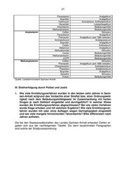21 Paracetamol Analgetikum Ibuprofen Analgetikum Hydroxyzin Anxiolytikum, Antihistaminikum Hexamidin Lokalantiseptikum Amphetamin Betäubungsmittel Methamphetamin Betäubungsmittel Amphetamin Coffein Stimulanz Paracetamol Analgetikum Phenacetin Analgetikum (seit 1986 verboten) Amitriptylinoxid Antidepressivum Ibuprofen Analgetikum Codein Antitussivum Metamizol Analgetikum Methylphenidat Stimulanz Cocain Betäubungsmittel Methamphetamin Betäubungsmittel mCPP Betäubungsmittel Methamphetamin Coffein Stimulanz Phenacetin Analgetikum (seit 1986 verboten) Chlorphenamin Antihistaminikum Piracetam Antidementivum Ibuprofen Analgetikum Ephedrin Stimulanz Kokain Betäubungsmittel Quelle: Landeskriminalamt Sachsen-Anhalt III. Strafverfolgung durch Polizei und Justiz 1. Wie viele Ermittlungsverfahren wurden in den letzten zehn Jahren in Sach- sen-Anhalt aufgrund des Verdachts einer Straftat bzw. einer Ordnungswid- rigkeit nach dem Betäubungsmittelgesetz im Zusammenhang mit harten Drogen je nach Deliktart eingeleitet und durchgeführt? In welcher Weise wurden die Ermittlungsverfahren abgeschlossen? Bei wie vielen Verfahren wurde Klage erhoben und mit welchem Ergebnis? Wie viele Ermittlungsver- fahren wurden mit oder ohne Auflagen wegen Geringfügigkeit eingestellt und wie viele mangels hinreichenden Tatverdachts? Bitte differenziert nach Jahren auflisten. Die bei den Staatsanwaltschaften des Landes Sachsen-Anhalt erfassten Zahlen er- geben sich aus der nachfolgenden Tabelle. Die darin bezeichneten Paragraphen sind solche der Strafprozessordnung.