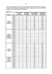 25 sowohl als Jugendlicher als auch als Heranwachsender oder Erwachsener begangen zu haben. Die statistische Erfassung der Person erfolgt aber nur einmal und zwar bezogen auf den eingetragenen Tatzeitpunkt. Tabelle 22: Beschuldigte Beschuldigte Beschuldigte He- Beschuldigte Kinder Jugendliche ranwachsende Erwachsene Behörde Jahr (bis 14 Jahre) (14-18 Jahre) (18 - 21 Jahre) (ab 21 Jahre) 2004 0 20 63 196 2005 5 154 333 637 2006 2 137 347 900 2007 1 161 331 1026 Staats- 2008 2 128 332 1060 anwaltschaft Magdeburg 2009 4 132 251 959 2010 9 171 289 1085 2011 3 187 402 1533 2012 8 206 260 1287 2013 5 247 278 1328 2004 0 0 0 0 2005 0 0 1 1 2006 0 2 1 6 Staats- 2007 0 0 1 5 anwaltschaft 2008 0 0 1 0 Magdeburg Zweigstelle 2009 0 0 0 1 Halberstadt 2010 0 0 0 1 2011 0 0 0 6 2012 0 0 0 4 2013 0 0 0 0 2004 3 42 121 269 2005 7 121 207 637 2006 4 165 331 945 2007 7 114 290 834 Staats- 2008 7 89 317 879 anwaltschaft Halle 2009 3 95 270 1071 2010 0 81 243 918 2011 1 99 223 1095 2012 5 147 185 1406 2013 2 124 180 1477 Staats- 2004 0 16 34 105 anwaltschaft Halle 2005 0 96 173 428 Zweigstelle 2006 0 82 128 426 Naumburg 2007 0 52 140 494 2008 0 27 133 593 2009 0 22 136 608 2010 0 14 84 493 2011 0 33 108 856