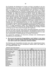 29 Der Runderlass des Ministeriums für Inneres und Sport „Grundsätze für die Ver- kehrsüberwachung durch Polizei und Kommunen (Verkehrsüberwachungserlass)“ greift im Themenfeld „polizeiliche Verkehrsüberwachung“ ebenfalls die Thematik Al- kohol und Drogen auf. Von Verkehrsteilnehmern, die unter Einfluss von Alkohol, Drogen und Medikamenten ein Fahrzeug im Straßenverkehr führen, gehen erhebli- che Gefahren aus. Aufgrund der überdurchschnittlichen Schwere der Folgen bei Ver- kehrsunfällen, die infolge des Konsums von Alkohol, Drogen oder Medikamenten verursacht werden, ist die Verhinderung, Feststellung und Sanktionierung derartiger Delikte besonders wichtig. Neben der grundsätzlichen Überprüfung der Fahrtüchtig- keit im Rahmen allgemeiner Verkehrskontrollen sind deshalb regelmäßig auch ge- zielte Kontrollen, wenn erforderlich dienststellen- und behördenübergreifend, zu pla- nen und durchzuführen. Auf eine umfangreiche Mitwirkung an entsprechenden euro- pa- oder bundesweiten Schwerpunktaktionen ist hinzuwirken. Daneben ist durch um- fassende Aus- und Fortbildungsmaßnahmen ein hoher Sensibilisierungsgrad der Kontrollkräfte für dieses Themenfeld anzustreben. Auf die Informationspflicht der Po- lizei gemäß § 2 Abs. 12 StVG bei festgestellter Beeinträchtigung der Fahruntüchtig- keit (z. B. infolge alkoholischer, drogen- oder medikamentös bedingter Beeinflus- sung), bei Hinweisen auf körperliche oder geistige Mängel oder sonstigen Zweifeln an der Eignung zum Führen eines Fahrzeuges wird hingewiesen. Darüber hinaus gibt es bei der Polizei diverse Informationsmaterialien und Kompen- dien, die sich mit der Thematik auseinandersetzen. Die Bandbreite erstreckt sich da- bei von Handlungsempfehlungen über Hinweise zur Eigensicherung bis hin zu aktu- ellen Straßenpreisen für Betäubungsmittel und aktuellen Grenzwerten. Die vorgenannten Unterlagen und Dokumente unterliegen einer anlassbezogenen Aktualisierung und Überarbeitung. 4. Wie hat sich die Anzahl der Drogendelikte je nach Deliktart in den letzten zehn Jahren in Sachsen-Anhalt entwickelt? Bitte differenziert aufschlüsseln nach Jahren sowie nach Landkreisen, kreisfreien Städten. Die Entwicklung der Drogendelikte der letzten zehn Jahre, aufgeschlüsselt entspre- chend der Fragestellung, ist in den nachfolgenden Tabellen sowie in den Anlagen 7a bis 7f dargestellt (Quelle: PKS): Tabelle 23: Harte Drogen (gesamt) kreisfreie Städte/ Landkreise Jahr 2004 2005 2006 2007 2008 2009 2010 2011 2012 2013 Dessau-Roßlau, Stadt 102 81 89 104 193 150 139 70 291 164 Halle (Saale), Stadt 246 220 333 220 193 319 169 231 246 281 Magdeburg 183 165 312 247 179 131 148 200 199 236 Altmarkkreis Salzwedel 53 22 29 36 17 93 33 51 60 56 Anhalt-Bitterfeld 401 213 296 132 110 67 105 106 168 324 Börde 32 48 56 59 77 67 68 122 210 176 Burgenlandkreis 287 314 311 405 361 483 383 689 507 401 Harz 131 178 210 206 199 186 234 295 262 311 Jerichower Land 61 70 48 61 47 150 48 34 43 109 Mansfeld-Südharz 51 93 107 101 183 254 182 202 269 231 Saalekreis 72 42 32 39 40 64 110 149 331 263 Salzlandkreis 440 492 327 179 147 178 150 248 209 265 Stendal 74 102 79 80 75 95 77 144 81 131