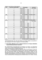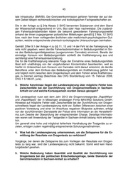 44 Tabelle 34: unter Einfluss von Drogen (gesamt) Jahr Anzahl der Verkehrsunfälle Altersgruppe Geschlecht 1 keine Angabe keine Angabe 1 15 bis unter 18 Jahre m 21 18 bis unter 25 Jahre m 2 18 bis unter 25 Jahre w 19 25 bis unter 65 Jahre m 2 25 bis unter 65 Jahre w 2009 46 VU unter Einfluss von Drogen, gesamt 28 18 bis unter 25 Jahre m 5 18 bis unter 25 Jahre w 26 25 bis unter 65 Jahre m 2 25 bis unter 65 Jahre w 2010 61 VU unter Einfluss von Drogen, gesamt 2 keine Angabe keine Angabe 1 keine Angabe m 27 18 bis unter 25 Jahre m 4 18 bis unter 25 Jahre w 26 25 bis unter 65 Jahre m 1 25 bis unter 65 Jahre w 2011 61 VU unter Einfluss von Drogen, gesamt 1 15 bis unter 18 Jahre w 23 18 bis unter 25 Jahre m 4 18 bis unter 25 Jahre w 41 25 bis unter 65 Jahre m 7 25 bis unter 65 Jahre w 2012 76 VU unter Einfluss von Drogen, gesamt 19 18 bis unter 25 Jahre m 1 18 bis unter 25 Jahre w 41 25 bis unter 65 Jahre m 8 25 bis unter 65 Jahre w 2013 69 VU unter Einfluss von Drogen, gesamt Verkehrsteilnehmende, die unter dem Einfluss von Drogen standen, verursachten in den vergangenen fünf Jahren insgesamt 313 Verkehrsunfälle. 2. Mit welchen Methoden wird in Sachsen-Anhalt die im Körper befindliche Rauschmittelkonzentration bestimmt? Die entsprechenden Einschränkungen des Rechts zum Führen von Fahrzeugen müssen dem Verhältnismäßigkeitsgrundsatz genügen. Sie müssen erforderlich, ge- eignet und angemessen im engeren Sinne sein. Es gelten u. a. die Rechtsnormen des StGB, des StVG und der Anlage zu § 24a Ab- satz 2 StVG, der Fahrerlaubnis-Verordnung (FeV) nebst der entsprechenden Anla- gen. Die Grenzwerte werden vom Gesetzgeber (§ 24a Absatz 1 StVG), von der Rechtsprechung (§§ 315c, 316 StGB) und mithilfe der „Grenzwertkommission“ nach aktuellen wissenschaftlichen Erkenntnissen festgelegt. Die Grenzwertkommission be- rät als fachübergreifende Arbeitsgruppe das Bundesministerium für Verkehr und digi-