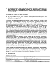 48 4. In welchem Umfang ist es innerhalb der letzten zehn Jahre zu Schulverwei- sen aufgrund des Konsums oder Handels mit harten Drogen in Sachsen- Anhalt gekommen? Bitte differenzieren nach Schulform, Drogensorte, Alter und Geschlecht. Es wird auf die Antwort zu Frage 1 verwiesen. 5. In welchen Schulstufen ist in welchem Umfang das Thema Drogen in den Lehrplänen vorgesehen? Grundlage für die Auseinandersetzung mit dem Thema Drogen und Süchte ist das Schulgesetz Sachsen-Anhalts. Hier wird im Erziehungs- und Bildungsauftrag der Schule (§ 1) der Gesundheitsaspekt aufgegriffen und im § 38 hinsichtlich der Schul- gesundheitspflege sowie der Sucht- und Drogenberatung näher konkretisiert. Im Schulverwaltungsblatt LSA Nr. 3/2913 (34-82113) vom 20. März 2013 werden die Empfehlungen zur Gesundheitsförderung und Prävention in der Schule, ein Be- schluss der Kultusministerkonferenz vom 15. November 2012 bekannt gemacht. Zu- dem findet sich a. a. O. die Bekanntmachung des MK vom 1. März 2013 (34-82113) zum Thema Suchtprävention in der Schule. In den Rahmenrichtlinien und Lehrplänen als verbindliche Grundlage für den Unterricht wird für verschiedene Schulformen und Schuljahrgänge die Auseinandersetzung mit Sucht und Drogen und den damit im Zusammenhang stehenden Themenbereichen (Cannabiskonsum, Zigaretten, Alkohol …) vorgeschrieben. Die Aufklärung über den Gebrauch und die Risiken bei der Einnahme suchtgefähr- dender Drogen steht in der Verantwortung der Lehrkräfte unter Berücksichtigung der konkreten Sachlage und Klassensituation. Im Lehrplan und in den Rahmenrichtlinien insbesondere der Fächer Biologie, Sozialkunde, Deutsch, Rechtskunde, Religionsun- terricht und Sport sind die Begrifflichkeiten explizit benannt und finden in der unter- richtlichen Behandlung breiten Raum und spielt unter Beachtung ggf. aktueller An- lässe eine große Rolle. Davon zeugt auch die Fülle der nachfolgend ausgewählten Inhalte und Themen zur Behandlung im Unterricht. Somit eröffnen die Rahmenrichtlinien und Lehrpläne mannigfaltige Möglichkeiten, den Umgang mit Cannabis und harten Drogen innerhalb des Themas „Drogen und Süchte“ zu thematisieren. Die inhaltlichen Schwerpunkte für die einzelnen Schuljahr- gänge und Schulformen sind der nachfolgenden Tabelle zu entnehmen: a) Grundschule Tabelle 35: Grundschule Kompetenzschwerpunkt Unterrichtsfach/ Teilkompetenzen Schuljahrgang Bereich Flexibel anwendbares Grundwissen zu Sachunterricht/ 4 Naturwissen- Mein Körper – Gesunderhaltung schaftlicher Bereich - Gefahren durch Suchtmittel, Abhängigkeiten, Alternativen
