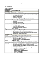49 b) Sekundarschule Tabelle 36: Sekundarschule Unterrichtsfach/ Kompetenzen Schuljahrgang grundlegende Wissensbestände Schuljahrgänge 5/6 Fächerübergreifender Schwerpunkt: Gesundes Leben Fächerübergreifendes Thema: Gesund und leistungsfähig ein Leben lang Hauswirtschaft Im Haushalt gesund leben und sich wohlfühlen - Faktoren für Gesundheit, Ernährung und Wohlbefinden benennen - Einflüsse ausgewählter Lebensmittel auf die Gesundheit nennen - den Gesundheitswert ausgewählter Lebensmittel beurteilen Mathematik Erfassen, Darstellen und Auswerten von Daten - Datenerhebungen - Datensammlungen und -darstellungen - Informationen aus Tabellen und Diagrammen Sport Wahrnehmen und Gesunderhalten des Körpers (Bewegungsfeld Fitness för- dern) - den Wert von Ernährung und Bewegung für die Förderung der Gesundheit be- greifen - wesentliche Faktoren, die die Gesundheit fördern, erkennen u. berücksichtigen Schuljahrgänge 7/8 Ethikunterricht Glück: Glücksversprechungen - sich über den Stellenwert von Konsum und Verzicht in einem gelingenden Leben verständigen - Sucht und Sehnsucht Sport Bewegungsfeld Laufen, Springen, Werfen - den Zusammenhang von sportlichen Höchstleistungen und leistungssteigernden Mitteln (Doping) kritisch werten Niveaubest. Aufga- - Stoff- und Energiewechsel: Magersucht, Fettleibigkeit ben Biologie - Zellen, Gewebe, Organe und Organsysteme: gesunde Lebensweise, Erkrankun- gen (u. a. durch Alkohol- und Nikotinmissbrauch) Schuljahrgänge 9/10 Fächerübergreifender Schwerpunkt: Gesundes Leben Fächerübergreifendes Thema: Gesund und leistungsfähig ein Leben lang – Lebensgestaltung ohne Sucht und Drogen Biologie Grundlagen des Verhaltens anwenden - Wirkung verschiedener Drogen auf Organfunktionen und Nervensystem be- schreiben Chemie Derivate der Kohlenwasserstoffe untersuchen und deren nützliche, gesund- heits- und klimaschädigende Eigenschaften beurteilen - Wirkungen des Alkoholkonsums auf den menschlichen Körper diskutieren - Schlussfolgerungen ableiten und Alkoholmissbrauch als gesellschaftliches Problem diskutieren - Alkohol als Droge charakterisieren und werten - Alkoholwerbung hinterfragen und eigene Schlussfolgerungen ableiten Hauswirtschaft Ernährungsverhalten untersuchen und beurteilen - gesundheitliche Risiken bei Sucht und Drogen diskutieren Sport Bewegungsfeld Laufen, Springen, Werfen - den Zusammenhang von sportlichen Höchstleistungen und leistungssteigernden Mitteln (Doping) kritisch werten Englisch Kommunikative Inhalte - Alltagsleben Problembewältigung Niveaubestimmende Umgang mit Alkohol Aufgabe Biologie - Wirkung von Alkohol