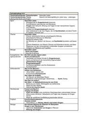 51 Schuljahrgänge 9/10 Fächerübergreifender Themenkomplex: Gesundes Leben Fächerübergreifendes Thema: Gesund und leistungsfähig ein Leben lang – Lebensges- taltung ohne Sucht und Drogen Sport Gesundes Leben - Beweggründe für Drogenkonsum benennen - Suchtstrukturen wahrnehmen und diskutieren - Drogen nach Herkunft, Wirkung und Folgen für den menschlichen Organis- mus erläutern - Anlässe von Drogenmissbrauch erkennen - über Institutionen in der ihrer Region, die mit Suchtkranken und deren Famili- en arbeiten, informiert sein Chemie Gesundes Leben - Ethanol: alkoholische Gärung, physiologische Wirkung - physiologische Wirkung von Alkanolen - Bedeutung weiterer Ester - die Wirkung von „Alkohol“ als Genuss- und Suchtmittel beurteilen und bewer- ten - typische Reaktionen von Ethanol, Ethanal und Ethansäure kennen und diese Reaktionen auf das Vorhandensein funktioneller Gruppen zurückführen - Giftigkeit von Methanol und Fuselölen Biologie Gesundes Leben - Sucht und Drogen - Gesunde Ernährung Evangelischer Re- Die Welt und das eigene Leben ligionsunterricht Sucht und Sehnsucht - individuelle und soziale Gründe für Drogenkonsum - Sucht und Sehnsucht als menschliche Eigenschaften - gebräuchliche Drogen - Drogenabhängigkeit - Suchtberatungsstellen und ihre Arbeitsweise - Suchtprävention Ethikunterricht Was ist der Mensch? Götzen und Heilslehren - „Neue Götter“ unserer Zeit - Konsumismus/Konsumsucht Das Leben als Aufgabe - Der Mensch als bedürftiges Wesen - Begriffliche Unterscheidungen: Bedürfnisse… … Sucht, Zwang Was darf ich hoffen? Gut leben – in Selbstbestimmung bis zum Ende - Befreiung zum Selbst: Abhängigkeit als Gefährdung - Wege aus dem Abseits - Klärung des Begriffes Sucht Rechtskunde Freizeit und Recht II Umgang mit Drogen - Arten von Drogen unter rechtlichen Gesichtspunkten unterscheiden können - differenzierte rechtliche Tatbestände und Folgen des Umgangs mit Drogen kennen - Wege der rechtlichen Konfliktlösung beschreiten können Englisch Kommunikationsbereiche Soziales Umfeld - Gesundheit (u. a. Alkohol, Nikotin und andere Drogen) Biologie Die zentrale Stellung der Pflanzen im Ökosystem Drogen in der Pflanzenwelt - natürliches Vorkommen von Drogen in Pflanzen - Wirkung von Drogen