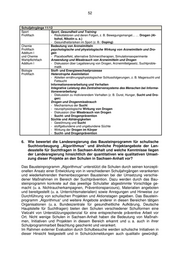 52 Schuljahrgänge 11/12 Sport Sport, Gesundheit und Training Profilfach - Risikofaktoren und deren Folgen, z. B. Bewegungsmangel... … Drogen (Al- kohol, Nikotin u. a.) - Gesundheitsrisiken im Sport (z. B.: Doping) Chemie Bedeutung von Arzneimitteln Profilfach psychologische und physiologische Wirkung von Arzneimitteln und Dro- Additum I gen und Chemie - Placeboeffekt, alternative Schmerztherapien, Simulationsexperimente Wahlpflichtfach Anwendung und Missbrauch von Arzneimitteln und Drogen Additum I - Diskussion über Legalisierung von Drogen, Arzneimittelgesetz, Suchtproble- matik Biologie Stoff- und Energiewechselprozesse Profilfach Heterotrophe Assimilation - Ableiten ernährungsphysiologischer Schlussfolgerungen, z. B. Magersucht und Fettsucht Informationsverarbeitung und Verhalten Integrative Leistung des Zentralnervensystems des Menschen bei Informa- tionsverarbeitung - Diskussion zu motivierendem Verhalten (z. B. Durst, Hunger, Sucht und Dro- gen) Drogen und Drogenmissbrauch - Mechanismus der Sucht - neurophysiologische Wirkung von Drogen - Diskussion über Missbrauch von Drogen - Sucht- und Drogenprävention Süchte und Abhängigkeiten - Gewöhnung und Sucht - stoffgebundene und ungebundene Süchte - Wirkung der Drogen im Körper - Sucht- und Drogenprävention 6. Wie bewertet die Landesregierung das Bausteinprogramm für schulische Suchtvorbeugung „Algorithmus“ und ähnliche Projektangebote der Lan- desstelle für Suchtfragen in Sachsen-Anhalt und welche Kenntnisse liegen der Landesregierung hinsichtlich der quantitativen wie qualitativen Umset- zung dieser Projekte an den Schulen in Sachsen-Anhalt vor? Das Bausteinprogramm „Algorithmus“ unterstützt die Schulen durch seinen konzepti- onellen Ansatz einer Entwicklung von in verschiedenen Schuljahrgängen verankerten und wiederkehrenden themenbezogenen Bausteinen bei der Umsetzung verschie- dener Maßnahmen im Bereich der Suchtprävention. Dazu werden durch das Bau- steinprogramm konkrete auf das jeweilige Schulalter abgestimmte Vorschläge ge- macht (u. a. Nichtraucherkampagnen, Präventionsparcours), Materialien angeboten und bereitgestellt (u. a. Unterrichtsmaterialien) sowie Anregungen und Hinweise zur Durchführung von schulischen Projekten und Aktionstagen gegeben. Das Baustein- programm „Algorithmus“ und weitere Angebote anderer in diesen Bereichen tätigen Organisationen (u. a. Bundeszentrale für gesundheitliche Aufklärung, Deutsche Hauptstelle für Suchtfragen) bieten den Schulen verschiedener Schulformen eine Vielzahl von Unterstützungspotenzial für eine entsprechende präventive Arbeit vor Ort. Nicht wenige Schulen in Sachsen-Anhalt haben die Bedeutung von Maßnah- men, Initiativen und Projekten in diesem Bereich erkannt und u. a. auch in ihrer Schulprogrammarbeit Beachtung geschenkt und verankert. Im Rahmen externer Evaluation durch Schulbesuche werden schulische Initiativen in dieser Hinsicht festgestellt und in Schulrückmeldungen auch qualitativ gewürdigt.