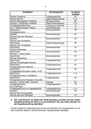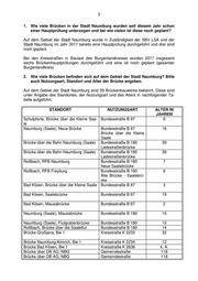 4 STANDORT NUTZUNGSART ALTER IN JAHREN Brücke Thainburg Fußgängerbrücke 97 Brücke Almrich Saale Radwanderweg k. A. Brücke Mausagraben, Roßbach Blütengrundweg 95 Brücke ü. Postgraben, Roßbach Saale Radwanderweg k. A. Fußgängerbrücke Eulau Fußweg zum Schloss 3 Br. ü. Neidschützbach, Boblas Gemeindestraße 6 Niedschütz Gemeindestraße 181 Flutgrabenbrücke Beuditz Gemeindestraße 67 Brücke über den Steinbach Beuditz Gemeindestraße 82 Brücke über die Wethau Bad Kösen Saale Radwanderweg 95 Brücke über Postgraben Bad Kösen Gemeindestraße 24 Zufahrt Kläranlage Bad Kösen Gemeindestraße 85 Brücke ü. „Kleine Saale“ Bad Kösen Gemeindestraße 52 Brücke Köppelberg Bad Kösen Fußgängerbrücke 27 Brücke Rudelsburgpromenade Bad Kösen Fußgängerbrücke 81 Fußgängerbrücke Radinsel Bad Kösen Fußgängerbrücke 89 Fußgängerbrücke Kleine Saale – B 87 Bad Kösen Fußgängerbrücke k. A. Fußgängerbrücke ü. Scheitbach Bad Kösen Fußgängersteg 52 Fußgängerbrücke Parkplatz Uferstraße Brücke u. Kleine Saale Radinsel Radweg 62 Fußgängerbrücke Fußgängerbrücke 19 Am Fischhaus Fußgängerbrücke vor Vogteigebäude Fußgängerbrücke k. A. Saaleck Gemeindestraße 50 Brücke DB AG Burgstraße Brücke über den Steinbach Gemeindestraße 67 3. Wie viele Brücken im Gebiet der Stadt Naumburg erhielten bei der letzten Hauptüberprüfung die Note 3,5 und schlechter? Bei wie vielen Brücken ist die Hauptüberprüfung überfällig? Auf dem Gebiet der Stadt Naumburg ist bei neun Brücken eine Zustandsnote von 3,5 oder schlechter bekannt. Derzeit sind sechs Hauptprüfungen überfällig.