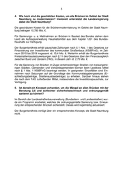 5 4. Wie hoch sind die geschätzten Kosten, um alle Brücken im Gebiet der Stadt Naumburg zu modernisieren? Inwieweit unterstützt die Landesregierung dabei die Stadt Naumburg? Die geschätzten Kosten für die Brückenmodernisierung im Gebiet der Stadt Naum- burg betragen 10,780 Mio. €. Für Sanierungs- u. a. Maßnahmen an Brücken in Baulast des Bundes stehen dem Land als Auftragsverwaltung Haushaltsmittel aus dem Kapitel 1201 des Bundes- haushalts zur Verfügung. Der Burgenlandkreis erhält pauschale Zahlungen nach § 1 Abs. 1 des Gesetzes zur Finanzierung von Investitionen des kommunalen Straßenbaus (KStBFinG), im Zeit- raum 2015 bis 2019 insgesamt rd. 10,4 Mio. €. Weiterhin erhält der Burgenlandkreis Kreisstraßenbaulastzuweisungen nach § 11 des Gesetzes über den Finanzausgleich zwischen Bund und Ländern (FAG), in diesem Jahr rd. 2,75 Mio. €. Für die Sanierung von Brücken im Zuge verkehrswichtiger Straßen von kreisangehö- rigen Städten, Gemeinden und Verbandsgemeinden können beim Landkreis Mittel nach § 1 Abs. 1 KStBFinG beantragt werden. In geeigneten Einzelfällen sind Ein- nahmen nach Satzungen auf der Grundlage des Kommunalabgabengesetzes (Er- schließungsbeiträge, Straßenausbaubeiträge) zu erheben. Darüber hinaus stehen die nach dem FAG zufließenden Mittel, insbesondere die Investitionspauschale, zur Verfügung. 5. Ist derzeit ein Konzept vorhanden, um die Mängel an allen Brücken mit der Benotung 3,5 und schlechter sicherheitstechnisch und ordnungsgemäß sanieren zu können? Im Bereich der Landesstraßenbauverwaltung (Bundesfern- und Landesstraßen) wur- de ein Programm erarbeitet, welches die ordnungsgemäße Sanierung bzw. Erneue- rung der entsprechenden Brücken sicherstellt. Dieses wird regelmäßig aktualisiert. Der Burgenlandkreis verfügt über ein entsprechendes Konzept, die Stadt Naumburg nicht.