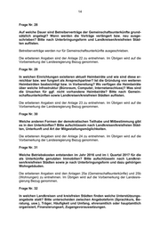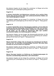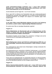 14 Frage Nr. 28 Auf welche Dauer sind Betreiberverträge der Gemeinschaftsunterkünfte grund- sätzlich angelegt? Wann werden die Verträge verlängert bzw. neu ausge- schrieben? Bitte nach Unterbringungsform und Landkreisen/kreisfreien Städ- ten auflisten. Betreiberverträge werden nur für Gemeinschaftsunterkünfte ausgeschrieben. Die erbetenen Angaben sind der Anlage 22 zu entnehmen. Im Übrigen wird auf die Vorbemerkung der Landesregierung Bezug genommen. Frage Nr. 29 In welchen Einrichtungen existieren aktuell Heimbeiräte und wie sind diese er- reichbar bzw. wer fungiert als Ansprechpartner? Ist die Gründung von weiteren Heimbeiräten beabsichtigt bzw. in Vorbereitung? Wo verfügen die Heimbeiräte über welche Infrastruktur (Büroraum, Computer, Internetanschluss)? Was sind die Ursachen für ggf. nicht vorhandene Heimbeiräte? Bitte nach Gemein- schaftsunterkünften sowie Landkreisen/kreisfreien Städten auflisten. Die erbetenen Angaben sind der Anlage 23 zu entnehmen. Im Übrigen wird auf die Vorbemerkung der Landesregierung Bezug genommen. Frage Nr. 30 Welche anderen Formen der demokratischen Teilhabe und Mitbestimmung gibt es in den Unterkünften? Bitte aufschlüsseln nach Landkreisen/kreisfreien Städ- ten, Unterkunft und Art der Mitgestaltungsmöglichkeiten. Die erbetenen Angaben sind der Anlage 24 zu entnehmen. Im Übrigen wird auf die Vorbemerkung der Landesregierung Bezug genommen. Frage Nr. 31 Welche Betriebskosten entstanden im Jahr 2016 und im I. Quartal 2017 für die als Unterkünfte genutzten Immobilien? Bitte aufschlüsseln nach Landkrei- sen/kreisfreien Städten sowie je nach Unterbringungsform und dazu gehörigen Wohngebäuden. Die erbetenen Angaben sind den Anlagen 25a (Gemeinschaftsunterkünfte) und 25b (Wohnungen) zu entnehmen. Im Übrigen wird auf die Vorbemerkung der Landesre- gierung Bezug genommen. Frage Nr. 32 In welchen Landkreisen und kreisfreien Städten finden welche Unterstützungs- angebote statt? Bitte unterscheiden zwischen Angebotsform (Sprachkurs, Be- ratung, usw.), Träger, Häufigkeit und Umfang, ehrenamtlich oder hauptamtlich organisiert, Finanzierungsart, Zugangsvoraussetzungen.