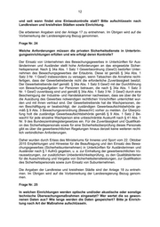 12 und seit wann findet eine Einlasskontrolle statt? Bitte aufschlüsseln nach Landkreisen und kreisfreien Städten sowie Einrichtung. Die erbetenen Angaben sind der Anlage 17 zu entnehmen. Im Übrigen wird auf die Vorbemerkung der Landesregierung Bezug genommen. Frage Nr. 24 Welche Anforderungen müssen die privaten Sicherheitsdienste in Unterbrin- gungseinrichtungen erfüllen und wie erfolgt deren Kontrolle? Der Einsatz von Unternehmen des Bewachungsgewerbes in Unterkünften für Aus- länderinnen und Ausländer stellt hohe Anforderungen an das eingesetzte Sicher- heitspersonal. Nach § 34a Abs. 1 Satz 1 Gewerbeordnung (GewO) bedürfen Unter- nehmen des Bewachungsgewerbes der Erlaubnis. Diese ist gemäß § 34a Abs. 1 Satz 3 Nr. 1 GewO insbesondere zu versagen, wenn Tatsachen die Annahme recht- fertigen, dass der Gewerbetreibende nicht die erforderliche Zuverlässigkeit besitzt. Der Gewerbetreibende darf gemäß § 34a Abs. 1 Satz 5 GewO mit der Durchführung von Bewachungsaufgaben nur Personen betrauen, die nach § 34a Abs. 1 Satz 3 Nr. 1 GewO zuverlässig sind und gemäß § 34a Abs. 1 Satz 3 Nr. 3 GewO durch eine Bescheinigung der Industrie- und Handelskammer nachweisen, dass sie über die für die Ausübung des Gewerbes notwendigen rechtlichen Vorschriften unterrichtet wur- den und mit ihnen vertraut sind. Der Gewerbetreibende hat die Wachpersonen, de- ren Beschäftigung er beabsichtigt, der zuständigen Gewerbeaufsichtsbehörde ge- mäß § 9 Abs. 3 Bewachungsverordnung (BewachV) vorher zu melden. Zur Überprü- fung holt die zuständige Gewerbeaufsichtsbehörde gemäß § 9 Abs. 1 Satz 2 Be- wachV für jede einzelne Wachperson eine unbeschränkte Auskunft nach § 41 Abs. 1 Nr. 9 des Bundeszentralregistergesetzes ein. Für die Zuverlässigkeit und Qualifikati- on des Sicherheitspersonals sowie für eine Sicherheitsüberprüfung dieses Personals gibt es über die gewerberechtlichen Regelungen hinaus derzeit keine weiteren recht- lich verbindlichen Anforderungen. Daher wurden durch Erlass des Ministeriums für Inneres und Sport vom 22. Oktober 2015 Empfehlungen und Hinweise für die Beauftragung und den Einsatz des Bewa- chungsgewerbes (Sicherheitsunternehmen) in Unterkünften für Ausländerinnen und Ausländer nach § 1 AufnG gegeben, u. a. zur Einhaltung der gewerberechtlichen Vo- raussetzungen, zur zusätzlichen Unbedenklichkeitsprüfung, zu den Qualitätskriterien für die Ausschreibung und Vergabe von Sicherheitsdienstleistungen, zur Qualifikation des Sicherheitspersonals sowie zum Einsatz von Subunternehmen. Die Angaben der Landkreise und kreisfreien Städte sind der Anlage 18 zu entneh- men. Im Übrigen wird auf die Vorbemerkung der Landesregierung Bezug genom- men. Frage Nr. 25 In welchen Einrichtungen werden optische und/oder akustische oder sonstige technische Überwachungsmaßnahmen eingesetzt? Wer wertet die so gewon- nenen Daten aus? Wie lange werden die Daten gespeichert? Bitte je Einrich- tung nach Art der Maßnahme aufschlüsseln.
