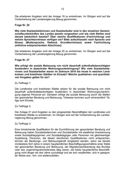 13 Die erbetenen Angaben sind der Anlage 19 zu entnehmen. Im Übrigen wird auf die Vorbemerkung der Landesregierung Bezug genommen. Frage Nr. 26 Wie viele Sozialarbeiterinnen und Sozialarbeiter sind in den einzelnen Gemein- schaftsunterkünften des Landes jeweils vorgesehen und wie viele Stellen sind derzeit tatsächlich besetzt? Über welche Qualifikationen (Fachrichtung) und welche Sprachkenntnisse verfügen sie? Bitte aufschlüsseln nach Sprache und Niveau (Muttersprache, fließend, Grundkenntnisse) sowie Fachrichtung (mit/ohne entsprechendem Abschluss). Die erbetenen Angaben sind der Anlage 20 zu entnehmen. Im Übrigen wird auf die Vorbemerkung der Landesregierung Bezug genommen. Frage Nr. 27 Wie erfolgt die soziale Betreuung von nicht dauerhaft aufenthaltsberechtigten Ausländern in dezentraler Wohnungsunterbringung? Wie viele Sozialarbeite- rinnen und Sozialarbeiter waren im Zeitraum 2016 bis heute in welchen Land- kreisen und kreisfreien Städten im Einsatz? Welche qualitativen und quantitati- ven Vorgaben gelten für sie? Zu Teilfrage 1: Die Landkreise und kreisfreien Städte setzen für die soziale Betreuung von nicht dauerhaft aufenthaltsberechtigten Ausländern in dezentraler Wohnungsunterbrin- gung eigenes Personal ein. Daneben erfolgt die soziale Bereuung durch die Stellen der gesonderten Beratung und Betreuung. Teilweise kommen auch ehrenamtlich Tä- tige zum Einsatz. Zu Teilfrage 2: Der Anlage 21 sind Angaben zu den eingesetzten Beschäftigten der Landkreise und kreisfreien Städte zu entnehmen. Im Übrigen wird auf die Vorbemerkung der Landes- regierung Bezug genommen. Zu Teilfrage 3: Eine hinreichende Qualifikation für die Durchführung der gesonderten Beratung und Betreuung haben Sozialarbeiterinnen und Sozialarbeiter mit staatlicher Anerkennung sowie Sozialpädagoginnen und Sozialpädagogen oder Personen mit gleichwertiger Ausbildung. Personen, die diesen beruflichen Qualifikationen nicht entsprechen, können als Beratungs- und Betreuungskraft eingesetzt werden, wenn sie bereits mindestens fünf Jahre in einem hauptamtlichen Beschäftigungsverhältnis einer Stelle der gesonderten Beratung und Betreuung, der Migrationserstberatung des Bundes oder des Jugendmigrationsdienstes tätig waren, die letzte hauptamtliche Beschäfti- gung nicht länger als drei Jahre zurückliegt und sie sich verpflichten, sich in geeigne- ter Weise aus-, fort- und weiterzubilden.