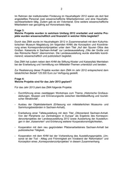 2 Im Rahmen der institutionellen Förderung im Haushaltsjahr 2012 waren als dort fest angestelltes Personal zwei wissenschaftliche Mitarbeiterinnen und eine Haushalts- sachbearbeiterin tätig. Zudem gab es ein Volontariat. Eine weitere wissenschaftliche Mitarbeiterin war ganzjährig auf Honorarbasis tätig. Frage 3: Welche Projekte wurden in welchem Umfang 2012 erarbeitet und welche Pro- jekte wurden wissenschaftlich und finanziell in welcher Höhe begleitet? Durch das ZMA wurde im Haushaltsjahr 2012 in Zusammenarbeit mit dem Kulturhis- torischen Museum Magdeburg (im folgenden KHM) die Konzeption und Koordinie- rung eines Korrespondenzortprojektes unter dem Titel „Auf den Spuren Ottos des Großen. Kaiserorte in Sachsen-Anhalt“ zur Landesausstellung „Otto der Große und das Römische Reich“ übernommen. Die Landesausstellung wurde ebenfalls koordi- nierend, wissenschaftlich und publizistisch begleitet. Das ZMA hat zudem neben dem KHM die Stiftung Kloster und Kaiserpfalz Memleben bei der Erarbeitung und Vermittlung von Mittelalter-Themen unterstützt und beraten. Zur Realisierung dieser Projekte wurden dem ZMA im Jahr 2012 entsprechend dem tatsächlichen Bedarf 125.500 Euro zur Verfügung gestellt. Frage 4: Welche Projekte sind für das Jahr 2013 geplant? Für das Jahr 2013 plant das ZMA folgende Projekte: - Durchführung eines zweitägigen Workshops zum Thema „Historische Großaus- stellungen, Museen und Erinnerungsorte zwischen Identitätsstiftung und touristi- scher Attraktivität“, - Ausbau der Objektdatenbank (Erfassung von mittelalterlichen Museums- und Sammlungsbeständen in Sachsen-Anhalt), - Erarbeitung einer Tafelausstellung mit dem Titel „Ottonenland Sachsen-Anhalt. Von der Peripherie zur Zentralregion in Europa“ als Ergebnis des Korrespon- denzortprojektes der Landesausstellung 2012 sowie Auswertung der Ausstellun- gen in den „Kaiserorten“ und Erörterung weiterer Kooperationsmöglichkeiten, - Kooperation mit dem neu gegründeten Pfalzenarbeitskreis Sachsen-Anhalt bei publizistischer Tätigkeit, - Kooperation mit dem KHM bei der Vorbereitung des Ausstellungsprojekts „Um- sonst ist der Tod - Alltag und Frömmigkeit am Vorabend der Reformation“ und Konzeption eines „Korrespondenzortprojektes“ in diesem Zusammenhang.