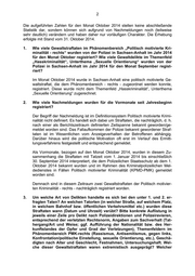 Landtag von Sachsen-Anhalt Drucksache 6/3705 16.12.2014 Antwort der Landesregierung auf eine Kleine Anfrage zur schrift- lichen Beantwortung Abgeordnete Henriette Quade (DIE LINKE) Abgeordneter Sebastian Striegel (BÜNDNIS 90/DIE GRÜNEN) Von der Polizei registrierte Gewaltstraftaten im Phänomenbereich „Politisch motivierte Kriminalität - rechts“ im Monat Oktober 2014 Kleine Anfrage - KA 6/8574 Vorbemerkung des Fragestellenden: Laut polizeilichem Definitionssystem „Politisch motivierte Kriminalität“ (PMK) gilt eine Tat als politisch motiviert, „wenn die Umstände der Tat oder die Einstellung des Tä- ters darauf schließen lassen, dass sie sich gegen eine Person aufgrund ihrer politi- schen Einstellung, Nationalität, Volkszugehörigkeit, Rasse, Hautfarbe, Religion, Weltanschauung, Herkunft, sexuellen Orientierung, Behinderung oder ihres äußeren Erscheinungsbildes bzw. ihres gesellschaftlichen Status richtet“ (vgl. u .a. BMI/BMJ (Hrsg.): Zweiter Periodischer Sicherheitsbericht, Berlin 2006, S. 135; VS-Bericht LSA 2012). Sachsen-Anhalt hat mit einer zunehmenden rechtsextremistischen Belastung zu kämpfen. Antwort der Landesregierung erstellt vom Ministerium für Inneres und Sport Namens der Landesregierung beantworte ich die Kleine Anfrage wie folgt: Vorbemerkung: Die nachfolgenden Angaben basieren auf dem durch das Landeskriminalamt Sach- sen-Anhalt erstellten „Lagebild Politisch motivierte Kriminalität“ (PMK). Im Lagebild PMK werden ausschließlich Fälle erfasst, die nach dem polizeilichen Ermittlungser- gebnis aufgrund zureichender tatsächlicher Anhaltspunkte den Verdacht für eine mit Strafe bedrohte Handlung begründen, der eine - zumindest zu vermutende - politi- sche Motivation (hierunter fallen auch rechtsextremistische, fremdenfeindliche und antisemitische Straftaten) zugrunde liegt. Hinweis: Die Anlage ist als Objekt beigefügt und öffnet durch Doppelklick im Netz den Acrobat Reader. (Ausgegeben am 17.12.2014)