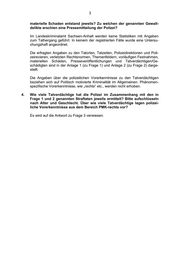 3 materielle Schaden entstand jeweils? Zu welchen der genannten Gewalt- delikte erschien eine Pressemitteilung der Polizei? Im Landeskriminalamt Sachsen-Anhalt werden keine Statistiken mit Angaben zum Tathergang geführt. In keinem der registrierten Fälle wurde eine Untersu- chungshaft angeordnet. Die erfragten Angaben zu den Tatorten, Tatzeiten, Polizeidirektionen und Poli- zeirevieren, verletzten Rechtsnormen, Themenfeldern, vorläufigen Festnahmen, materiellen Schäden, Presseveröffentlichungen und Tatverdächtigen/Ge- schädigten sind in der Anlage 1 (zu Frage 1) und Anlage 2 (zu Frage 2) darge- stellt. Die Angaben über die polizeilichen Vorerkenntnisse zu den Tatverdächtigen beziehen sich auf Politisch motivierte Kriminalität im Allgemeinen. Phänomen- spezifische Vorerkenntnisse, wie „rechts“ etc., werden nicht erhoben. 4. Wie viele Tatverdächtige hat die Polizei im Zusammenhang mit den in Frage 1 und 2 genannten Straftaten jeweils ermittelt? Bitte aufschlüsseln nach Alter und Geschlecht. Über wie viele Tatverdächtige lagen polizei- liche Vorerkenntnisse aus dem Bereich PMK-rechts vor? Es wird auf die Antwort zu Frage 3 verwiesen.