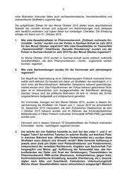 2 sche Motivation (hierunter fallen auch rechtsextremistische, fremdenfeindliche und antisemitische Straftaten) zugrunde liegt. Die aufgeführten Zahlen für den Monat Oktober 2015 stellen keine abschließende Statistik dar, sondern können sich aufgrund von Nachmeldungen noch (teilweise sehr deutlich) verändern und haben daher nur vorläufigen Charakter. Die Erhebung erfolgte mit Stand vom 31. Oktober 2015. 1. Wie viele Gewaltstraftaten im Phänomenbereich „Politisch motivierte Kri- minalität - rechts“ wurden von der Polizei in Sachsen-Anhalt im Jahr 2015 für den Monat Oktober registriert? Wie viele Gewaltdelikte im Themenfeld „Hasskriminalität“, Unterthema „Sexuelle Orientierung“ wurden von der Polizei in Sachsen-Anhalt im Jahr 2015 für den Monat Oktober registriert? Im Monat Oktober 2015 wurden in Sachsen-Anhalt sechs politisch motivierte Gewaltstraftaten, die dem Phänomenbereich - rechts - zugeordnet werden konnten, registriert. 2. Wie viele Nachmeldungen wurden für die Vormonate seit Jahresbeginn registriert? Der Begriff der Nachmeldung ist im Definitionssystem Politisch motivierte Krimi- nalität nicht definiert. Es handelt sich dabei um Straftaten, die nachträglich, d. h. nach einer als Berichtszeitraum definierten Zeitspanne bekannt geworden/ge- meldet worden sind. Das Fallaufkommen der Polizei bekannt gewordener Straf- taten ist im Wesentlichen vom Anzeigeverhalten der Betroffenen abhängig. Darüber hinaus wird die politische Motivation oft erst im Verlauf des Ermitt- lungsverfahrens festgestellt und entsprechend gemeldet. Als Vormonate, bezogen auf den Monat Oktober 2015, wurden in diesem Zu- sammenhang die Straftaten mit Tatzeit vom 1. Januar 2015 bis einschließlich 30. September 2015 interpretiert, die dem Polizeilichen Staatsschutz ab dem 1. Oktober 2015 bekannt wurden und im Rahmen des Kriminalpolizeilichen Meldedienstes in Fällen Politisch motivierter Kriminalität (KPMD-PMK) gemeldet worden sind. Demnach sind in diesem Zeitraum 15 Gewaltstraftaten der Politisch motivierten Kriminalität - rechts - nachträglich registriert worden. 3. Um welche Art von Delikten handelte es sich bei den unter 1. und 2. er- fragten Taten? An welchen Tatorten (in welcher Straße, auf welchem Platz, in welchem Bahnhof bzw. öffentlichen Verkehrsmittel etc.) wurden diese Straftaten wann (Datum und Uhrzeit) verübt? Bitte konkrete Auflistung in jeweils einer Zeile pro Delikt nach Polizeidirektionen und Polizeirevieren, entsprechend der verletzten Rechtsnorm, Angaben zum Sachverhalt (Tat- hergang/Art und Weise; ggf. Aufführung der Nationalität bzw. des Her- kunftslandes der Opfer und Grad der Verletzungen), Themenfeldern im Phänomenbereich PMK-rechts (Rassismus, Antisemitismus, gegen links, Konfrontation/politische Einstellung, sexuelle Orientierung, etc.), Geschä- digten nach Alter und Geschlecht, Festnahmen, Untersuchungshaft. Welche dieser Gewaltstraftaten waren extremistisch ausgeprägt? Welcher