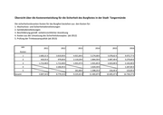 Übersicht über die Kostenentwicklung für die Sicherheit des Burgfestes in der Stadt Tangermünde Die sicherheitsrelevanten Kosten für das Burgfest bestehen aus den Kosten für: 1. Wachschutz- und Sicherheitsdienstleistungen 2. Sanitätsdienstleistungen 3. Beschilderung gemäß verkehrsrechtlicher Anordnung 4. Kosten aus der Umsetzung des Sicherheitskonzeptes (ab 2012) 5. Prüfung der Trinkwasserqualität (ab 2013) Jahr 2011 2012 2013 2014 2015 2016 Kosten 1 2.683,31 € 3.819,90 € 4.921,84 € 5.274,68 € 5.078,62 € 9.975,77 € 2 410,55 € 979,00 € 2.110,20 € 1.864,50 € 3.087,40 € 3.279,60 € 3 1.713,48 € 1.713,48 € 1.931,97 € 1.921,85 € 2.023,00 € 2.142,00 € 4 2.266,95 € 1.024,59 € 1.207,85 € 5 261,80 € 1.398,25 € 216,45 € 123,05 € Gesamt 4.807,34 € 8.779,33 € 9.225,81 € 11.483,87 € 10.405,47 € 16.728,27 €