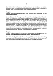 2 Des Weiteren fand im November eine Ausschreibung von drei Stellen zur Nachbe- setzung für diese Förderschule unter pädagogischen Mitarbeiterinnen an Grundschu- len statt. Diese Ausschreibung blieb leider ohne Bewerbungen. Frage 2: Welche konkreten Maßnahmen sind Ihrer Ansicht nach notwendig, um der Situation abzuhelfen? Um der Situation der Versorgung von Förderschulen mit pädagogischen Mitarbeite- rinnen und Mitarbeitern mittel- und langfristig insgesamt gerecht zu werden, wird im Kultusministerium gegenwärtig daran gearbeitet, die schulform- und aufgabenbezo- genen Bedarfsparameter für den Einsatz der pädagogischen Mitarbeiterinnen und Mitarbeiter anzupassen. Diese Bedarfsparameter sollen zum Schuljahr 2016/2017 die Berechnungsgrundlage der Zuweisung von pädagogischen Mitarbeiterinnen und Mitarbeitern bilden. Ziel ist es, im Rahmen der vorhandenen personellen Möglichkei- ten des Landes zum Schuljahr 2016/2017 einen Personalausgleich vorzubereiten und die personelle Ausstattung der Schulen abzusichern. Künftig wird aber auch die Möglichkeit der Eröffnung von Einstellungskorridoren für pädagogische Mitarbeiter zur Kompensierung der jährlichen Ausscheidefälle zu prüfen sein. Frage 3: Wird es im Ergebnis der Prüfungen eine Aufstockung der pädagogischen Mit- arbeiter an der Makarenkoschule geben? Wenn nein, warum nicht? Angesichts des Ergebnisses der Ausschreibung prüft das Landesschulamt kurzfristig weitere personalrechtliche Maßnahmen, um die Situation an der Schule zu verbes- sern. Mittel- und langfristig wird auf die Beantwortung zu Frage 2 verwiesen.