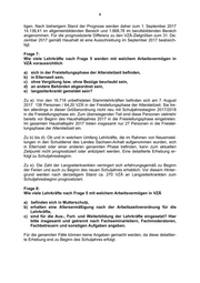 3 Nicht hinzugerechnet zu dieser Gesamtzahl sind die 877 unbefristeten Stammlehr- kräfte, die sich bereits seit geraumer Zeit in der Freistellungsphase der Altersteilzeit befinden und auf der Grundlage der damaligen haushaltsrechtlichen Vorgaben in den Einzelplan 13 überführt wurden. Mit der Auslagerung in den Einzelplan 13 sind sie nicht mehr haushaltsrelevant für den Einzelplan 07 und besetzen dort somit weder Stellen, noch Vollzeitäquivalente. In der Konsequenz führt ihr endgültiger Eintritt in die Altersrente/den Ruhestand im Einzelplan 07 weder zu frei werdenden Stel- len/Planstellen, noch verfügbaren Vollzeitäquivalenten oder Personalmitteln. Die Beantwortung der nachfolgenden Fragen - insbesondere Frage 7 a) - erfolgt so- mit ausschließlich für die unbefristeten Stammlehrkräfte des Einzelplan 07. Frage 6: In welchem Umfang wird durch den voraussichtlichen Lehrkräftebestand nach Frage 5 das Vollzeitäquivalentziel von 16.117 ausgeschöpft? Bitte insgesamt und getrennt nach den Schulformen angeben. Bei dem in der Fragestellung genannten Vollzeitäquivalent von 16.117 wurde durch den Fragesteller eine Addition der Zielgröße für Lehrkräfte im allgemeinbildenden Bereich (14.237 zum 31. Dezember 2017) und der Zielgröße für Lehrkräfte im be- rufsbildenden Bereich (1.880 zum 31. Dezember 2017) vorgenommen. Eine solche zusammengefasste Zielgröße sieht der Haushaltsplan für die Haushaltsjahre 2017 und 2018 nicht vor. Auszugehen ist vielmehr von einer haushaltswirtschaftlichen Zielgröße von 14.237 VZÄ zum 31. Dezember 2017 für den Bereich der allgemein- bildenden Schulen und 1.880 VZÄ zum 31. Dezember 2017 für den Bereich der be- rufsbildenden Schulen. Prognostiziert werden unter Zugrundelegung des in Frage 5 genannten Personalbe- standes zum Stichtag 7. August 2017 folgende VZÄ: vorauss. Anzahl Lehrkräfte in VzÄ zum 31.12.2017 (einschl. der An- nahme, dass die ausgeschriebe- nen 370 Stellen bis zum 7.8.2017 besetzt werden) Allgemeinbildende Schulen 14.189,25 Grundschulen 4.015,12 Sekundar- und Gemein- 4.067,73 schaftsschulen Gymnasien 3.565,92 Schulen des Zweiten Bil- 40,83 dungsweges Gesamtschulen 440,23 Förderschulen 2.059,43 Berufsbildende Schulen 1.874,57 In der Prognose ist ab 10. August 2017 eine geringfügige Absenkung des VZÄ infol- ge des Wirksamwerdens genehmigter Teilzeitanträge von bereits im System befind- lichen Stammlehrkräften bei der Berechnung der VZÄ-Ausschöpfung zu berücksich-