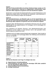 5 Frage 9: Wie viele Förderschullehrkräfte mit welchem Arbeitsvermögen werden zur För- derung im gemeinsamen Unterricht an Regelschulen voraussichtlich einge- setzt sein? Bitte insgesamt und getrennt nach den Schulformen angeben. Derzeit kann nur die Anzahl der Abordnungsstunden von einer Förderschule an eine Regelschule ermittelt werden. Die Erhebung zum detaillierten Unterrichtseinsatz er- folgt erst mit der Erhebung zu Beginn des Schuljahres. Frage 10: Wie viele Bewerberinnen und Bewerber gab es auf die Ausschreibung vom 28. April 2017 (ohne Mehrfachbewerbungen)? Auf wie viele Stellen gab es keine Bewerbung? Bitte insgesamt und getrennt nach den Schulformen angeben. Insgesamt gaben 789 Bewerberinnen und Bewerber (Personen) eine oder mehrere Bewerbungen für die ausgeschriebenen 370 vorrangigen und 80 nachrangigen Ein- stellungsoptionen ab. Eine Unterteilung der Bewerber (Personen, ohne Mehrfachbewerbungen) nach Schulformen ist nicht möglich, da dies technisch nicht in dem genutzten Online- Bewerbungsportal programmiert wurde. Insgesamt sind für 20 Stellen keinerlei Bewerbungen eingegangen. Dabei handelt es sich um 14 vorrangige und 6 nachrangige Stellen. Die Verteilung auf die Schulformen stellt sich wie folgt dar: vorran- nachrangi- vorrangige nachrangi- gige ge Stellen Stellen oh- ge Stellen Stellen ne Bewer- ohne Be- ber werber berufsbildende 20 40 - 3 Schulen Förderschulen 36 7 8 2 Gemein- 48 4 2 - schaftsschulen Gesamt- 18 - - - schulen Grundschulen 52 12 - - Gymnasien 88 6 - - Sekundar- 108 11 4 1 schulen 370 80 14 6 Frage 11: Wie viele der Bewerber nach Frage 10 verfügten über eine: a) abgeschlossene Lehramtsausbildung, b) Lehrerausbildung nach dem Recht der ehemaligen DDR (bitte zusätzlich nach den Abschlüssen differenzieren), c) wissenschaftliche Hochschulausbildung, d) sonstige Ausbildung?