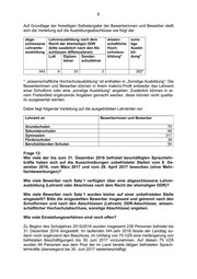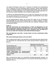 6 Auf Grundlage der freiwilligen Selbstangabe der Bewerberinnen und Bewerber stellt sich die Verteilung auf die Ausbildungsabschlüsse wie folgt dar: abge- Lehrerausbildung nach dem wissen- sons- schlossene Recht der ehemaligen DDR schaftliche tige Lehramts- (bitte zusätzlich nach den Ab- Hoch- Ausbil- ausbildung schlüssen differenzieren) schulaus- bil- LuK Diplom- Sonder- bildung* dung* lehrer schullehrer 543 9 33 2 202* * „wissenschaftliche Hochschulausbildung“ ist enthalten in „Sonstige Ausbildung“: Die Bewerberinnen und Bewerber können in ihrem matorix-Profil entweder das Lehramt einer Schulform oder eine „sonstige Ausbildung“ angeben. Zusätzlich können in ei- nem Freitextfeld ergänzende Angaben gemacht werden, diese können nicht qualita- tiv ausgewertet werden. Dabei liegt folgende Verteilung auf die ausgebildeten Lehrämter vor: Lehramt an Bewerberinnen und Bewerber Grundschulen 70 Sekundarschulen 68 Gymnasien 317 Förderschulen 38 Berufsbildenden Schulen 50 Frage 12: Wie viele der bis zum 31. Dezember 2016 befristet beschäftigten Sprachlehr- kräfte haben sich auf die Ausschreibungen unbefristeter Stellen vom 8. De- zember 2016, vom März 2017 und vom 28. April 2017 beworben (ohne Mehr- fachbewerbungen)? Wie viele Bewerber nach Satz 1 verfügten über eine abgeschlossene Lehrer- ausbildung (Lehramt oder Abschluss nach dem Recht der ehemaligen DDR)? Wie viele Bewerber nach Satz 1 wurden bisher auf einer unbefristeten Stelle eingestellt? Bitte die eingestellten Bewerber insgesamt und getrennt nach den Schulformen und nach den Abschlüssen (Lehramt, DDR-Abschlüsse, wissen- schaftlicher Hochschulabschluss, sonstige Abschlüsse) angeben. Wie viele Einstellungsverfahren sind noch offen? Zu Beginn des Schuljahres 2015/2016 wurden insgesamt 238 Personen befristet bis 31. Dezember 2016 eingestellt. Im laufenden HH-Jahr 2016 fasste der Landtag so- dann noch ergänzend den Beschluss, im Umfang von 75 VZÄ eine Verlängerung von befristeten Beschäftigungen bis 30. Juni 2017 vorzunehmen. Auf diesen 75 VZÄ wurden 84 Personen aus dem Pool der im Land bereits tätigen befristeten Sprach- lehrkräfte überwiegend bis 30. Juni 2017 weiterbeschäftigt.
