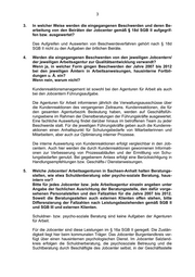 3 3. In welcher Weise werden die eingegangenen Beschwerden und deren Be- arbeitung von den Beiräten der Jobcenter gemäß § 18d SGB II aufgegrif- fen bzw. ausgewertet? Das Aufgreifen und Auswerten von Beschwerdeverfahren gehört nach § 18d SGB II nicht zu den Aufgaben der örtlichen Beiräte. 4. Werden die eingegangenen Beschwerden von den jeweiligen Jobcentern/ der jeweiligen Arbeitsagentur zur Qualitätsentwicklung verwandt? Wenn ja, in welcher Form gingen Beschwerden der Jahre 2007 bis 2012 bei den jeweiligen Ämtern in Arbeitsanweisungen, hausinterne Fortbil- dungen u. Ä. ein? Wenn nein, warum nicht? Kundenreaktionsmanagement ist sowohl bei den Agenturen für Arbeit als auch bei den Jobcentern Führungsaufgabe. Die Agenturen für Arbeit informieren jährlich die Verwaltungsausschüsse über die Kundenreaktionen des vergangenen Zeitraums. Kundenreaktionen, die für den gesamten Agenturbezirk Bedeutung haben, werden auf Geschäftsfüh- rungsebene im Rahmen der Dienstberatungen der Führungskräfte ausgewertet. Eine fachliche Auswertung findet darüber hinaus im betroffenen Team zu jeder Beschwerde statt. Für die jeweiligen Führungskräfte geben auch die Kundenre- aktionen einen Anhaltspunkt für Schulungsbedarfe von Mitarbeiterinnen und Mitarbeitern, aber auch zur Optimierung interner Prozesse. Die interne Auswertung von Kundenreaktionen erfolgt vergleichbar in den Job- centern. Auch hier werden die durch Kundenreaktionen gewonnenen Informati- onen zur Verbesserung von Prozessabläufen und der Ermittlung von Schu- lungsbedarfen genutzt. Bei gegebenem Anlass erfolgt eine Berücksichtigung in Handlungsempfehlungen bzw. Geschäfts-/ Dienstanweisungen. 5. Welche Jobcenter/ Arbeitsagenturen in Sachsen-Anhalt halten Beratungs- stellen, wie etwa Schuldenberatung oder psycho-soziale Beratung, haus- intern vor? Bitte für jedes Jobcenter bzw. jede Arbeitsagentur einzeln angeben unter Angabe der fachlichen Ausrichtung der Beratungsstelle, den dafür vorge- sehenen Personalstellen und den Fallzahlen für die Jahre 2007 bis 2012. Soweit die Beratungsstellen auch externen Klienten offen stehen, bitte Differenzierung der Fallzahlen nach Leistungsbeziehenden gemäß SGB II und SGB III und externen Klienten. Schuldner- bzw. psycho-soziale Beratung sind keine Aufgaben der Agenturen für Arbeit. Für die Jobcenter sind diese Leistungen im § 16a SGB II geregelt. Die Zustän- digkeit liegt hier beim kommunalen Träger. Das Jobcenter Burgenlandkreis ver- fügt über einen hausinternen psychologischen Dienst. Im Jobcenter Salzland- kreis erfolgen die Schuldnerberatung, die psychosoziale Betreuung und die Suchtberatung durch Beschäftigte des Jobcenter selbst, in der Geschäftsstelle