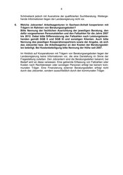 4 Schönebeck jedoch mit Ausnahme der qualifizierten Suchtberatung. Weiterge- hende Informationen liegen der Landesregierung nicht vor. 6. Welche Jobcenter/ Arbeitsagenturen in Sachsen-Anhalt kooperieren mit Trägern im Rahmen von Beratungsangeboten? Bitte Nennung der fachlichen Ausrichtung der jeweiligen Beratung, den dafür vorgesehenen Personalstellen und den Fallzahlen für die Jahre 2007 bis 2012. Dabei bitte Differenzierung der Fallzahlen nach Leistungsbezie- henden gemäß SGB II und SGB III und sonstigen Klienten. Auch bitte Nennung des jeweiligen Kooperationspartners sowie der Angabe, ob sich das Jobcenter bzw. die Arbeitsagentur an den Kosten der Beratungsstel- len beteiligt. Bei Kostenbeteiligung bitte Nennung der Höhe seit 2007. Im Hinblick auf Kooperationen mit Trägern von Beratungsangeboten liegen der Landesregierung keine Informationen vor, die eine Darstellung im Sinne der Fragestellung zuließen. Den Jobcentern sind die Beratungsstellen bekannt, bei Bedarf wird an diese verwiesen. Eine getrennte Erfassung von Fallzahlen oder Kosten nach Rechtskreisen oder sonstigen Personen erfolgt bei keinem kom- munalen Träger. Eine Finanzierung externer Beratungsstellen erfolgt nicht durch das Jobcenter, sondern ausschließlich durch den kommunalen Träger.