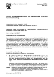 Landtag von Sachsen-Anhalt Drucksache 6/3725 08.01.2015 Antwort der Landesregierung auf eine Kleine Anfrage zur schrift- lichen Beantwortung Abgeordnete Henriette Quade (DIE LINKE) Abgeordneter Sebastian Striegel (BÜNDNIS 90/DIE GRÜNEN) Juristische Folgen von Straftaten im Phänomenbereich „Politisch motivierte Kriminalität - rechts“ im III. Quartal 2014 Kleine Anfrage - KA 6/8557 Vorbemerkung des Fragestellenden: Laut polizeilichem Definitionssystem „Politisch motivierte Kriminalität“ (PMK) gilt eine Tat als politisch motiviert, »wenn die Umstände der Tat oder die Einstellung des Tä- ters darauf schließen lassen, dass sie sich gegen eine Person aufgrund ihrer poli- tischen Einstellung, Nationalität, Volkszugehörigkeit, Rasse, Hautfarbe, Religion, Weltanschauung, Herkunft, sexuellen Orientierung, Behinderung oder ihres äußeren Erscheinungsbildes bzw. ihres gesellschaftlichen Status richtet« (vgl. u. a. BMI/BMJ (Hrsg.): Zweiter Periodischer Sicherheitsbericht, Berlin 2006, S. 135; VS-Bericht LSA 2012). Sachsen-Anhalt hat mit einer zunehmenden rechtsextremistischen Belastung zu kämpfen. Antwort der Landesregierung erstellt vom Ministerium für Justiz und Gleichstellung 1. Zu welchen Verurteilungen (Art der Strafen und Strafmaß) aufgrund von Straftaten im Phänomenbereich „Politisch motivierte Kriminalität - rechts“ kam es in Sachsen-Anhalt im III. Quartal 2014 (aufgeschlüsselt nach Tat- tagen, Tatort, Tathergang, Straftatbestand, Anzahl Beschuldigte und Al- ter)? Wie bereits in der Antwort der Landesregierung auf Frage 1 der Kleinen Anfra- ge „Juristische Folgen von Straftaten im Phänomenbereich „Politisch motivierte Kriminalität - rechts“ im II. Quartal 2014“ (LT-Drs. 6/3431 vom 11.09.2014) aus- Hinweis: Die Anlage ist in Word als Objekt beigefügt und öffnet durch Doppelklick im Netz den Acrobat Rea- der. Die Drucksache steht vollständig digital im Internet/Intranet zur Verfügung. Bei Bedarf kann Einsichtnahme in der Bibliothek des Landtages von Sachsen-Anhalt er- folgen oder die gedruckte Form abgefordert werden. (Ausgegeben am 08.01.2015)