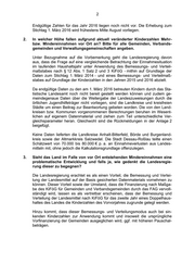 Landtag von Sachsen-Anhalt Drucksache 7/225 10.08.2016 Antwort der Landesregierung auf eine Kleine Anfrage zur schrift- lichen Beantwortung Abgeordnete Monika Hohmann (DIE LINKE) Mehr- und Mindereinnahmen der Gemeinden im Rahmen der Kinderbetreuung aufgrund schwankender Kinderzahlen Kleine Anfrage - KA 7/91 Vorbemerkung der Fragestellenden: Das Land bemisst und verteilt seine Mittel zur Finanzierung der Kinderbetreuung auf der Basis der Statistik „Tageseinrichtungen für Kinder und öffentlich geförderte Ta- gespflege“ des Statistischen Landesamtes zum 1. März des jeweiligen Vorjahres. Im Falle eines Doppelhaushalts ist für das zweite Haushaltsjahr die entsprechende Statistik zum 1. März des Vorvorjahres zugrunde zu legen. Antwort der Landesregierung erstellt vom Ministerium für Arbeit, Soziales und Integration 1. Wie viele Kinder wurden in den Jahren 2014, 2015 und 2016 in den Kinder- tageseinrichtungen betreut? Bitte für alle Gemeinden, Verbandsgemein- den und Verwaltungsgemeinschaften getrennt nach Krippe, Kindergarten und Hort angeben. Hinsichtlich der Beantwortung wird für die Stichtage 1. März 2014 und 1. März 2015 auf die Anlage 1 verwiesen. Die Auswertung erfolgte teilweise nur bis auf Ebene der Verbandsgemeinden, da aus Gründen der statistischen Geheimhal- tung gemäß § 16 Bundesstatistikgesetz i. V. m. §§ 98 ff. SGB VIII keine Ge- meinde mit weniger als 3 Kindertageseinrichtungen ausgewiesen werden darf (Einrichtungsschutz). Hinweis: Die Drucksache steht vollständig digital im Internet/Intranet zur Verfügung. Die Anlage ist in Word als Objekt beigefügt und öffnet durch Doppelklick den Acrobat Reader. Bei Bedarf kann Einsichtnahme in der Bibliothek des Landtages von Sachsen-Anhalt er- folgen oder die gedruckte Form abgefordert werden. (Ausgegeben am 10.08.2016)