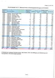 KiyuHi-Statistik Teil 3.1 - Betreute Kinder in Kindertageseinrichtungen am 01.03.2015 Kreisfreie Anzahl der Kinder [Kinder 3 Jahre Stadt/ [Gemeinde |Name Tagesein- | Gesamt| unter 3 bis Beginn | Schulkinder Landkreis richtungen Jahre Schulpflicht 15089 15089307 Seeland, Stadt 6 456 118 195 143 15089 15089305 Schönebeck (Elbe), Stadt 22 1943 402 867 674 15089 15089235 Nienburg (Saale), Stadt 8 427 65 145 217 15089 15089195 Könnern, Stadt 9 506 109 226 171 15089 15089175 Hecklingen, Stadt 4 467 99 216 152 15089 15089055 Calbe (Saale), Stadt 6 534 111 257 166 15089 15089042 Bördeland 7 445 108 178 159 15089 15089030 Bernburg (Saale), Stadt 26 2001 462 902 637 15089 15089026 Barby, Stadt 7 522 109 197 216 15089 15089015 Aschersleben, Stadt 23 1679 338 696 645 15089 158952 VBG Saale-Wipper 9 653 152 289 212 15089 158951 VBG Egelner Mulde 9 691 177 307 207 15089 150898 Salzlandkreis Se 155 11864 2521 5163 4080 15090 15090550 Tangermünde, Stadt 5 533 120 269 144 15090 15090546 Tangerhütte, Stadt 11 593 138 276 179 15090 15090535 Stendal, Hansestadt 29 2261 468 1171 622 15090 15090415 Osterburg (Altmark), Hansestadt 9 553 104 267 182 15090 15090225 Havelberg, Hansestadt 4 362 63 185 114 15090 15090070 Bismark (Altmark), Stadt 12 504 113 235 156 15090 159053 VBG Seehausen (Altmark) 13 527 115 267 145 15090 159052 VBG Elbe-Havel-Land 9 455 92 215 148 15090 159051 VBG Arneburg-Goldbeck 14 562 118 260 184 15090 15090 Stendal 106 6350 1331 3145 1874 15091 15091391 Zahna-Elster, Stadt B 514 111 221 182 15091 15091375 Wittenberg, Lutherstadt 44 3000 584 1322 1094 15091 15091241 Oranienbaum-Wörlitz, Stadt 8 506 114 233 159 15091 15091160 Kemberg, Stadt 12 532 111 226 195 15091 15091145 Jessen (Elster), Stadt 13 864 198 366 300 15091 15091110 Gräfenhainichen, Stadt 11 729 150 332 247 15091 15091060 Coswig (Anhalt), Stadt 9 721 158 323 240 15091 15091020 Bad Schmiedeberg, Stadt 7 469 97 218 154 15091010 Annaburg, Stadt 3 339 74 169 96 15081 Witerterg 115 7674 1597 3410 2667 15 15 Sachsen-Anhalt 1774 139757 29216 61384 49157 © Statistisches Landesamt Sachsen-Anhalt, Halle (Saale), 2016, Vervielfältigung und Verbreitung, auch auszugsweise, mit Quellenangabe gestattet 3von 3